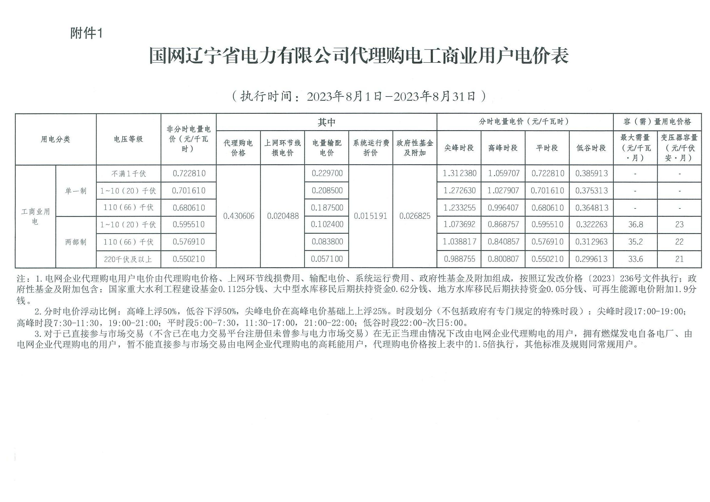 遼寧省8月份代理購電工商業(yè)用戶電價(jià)表