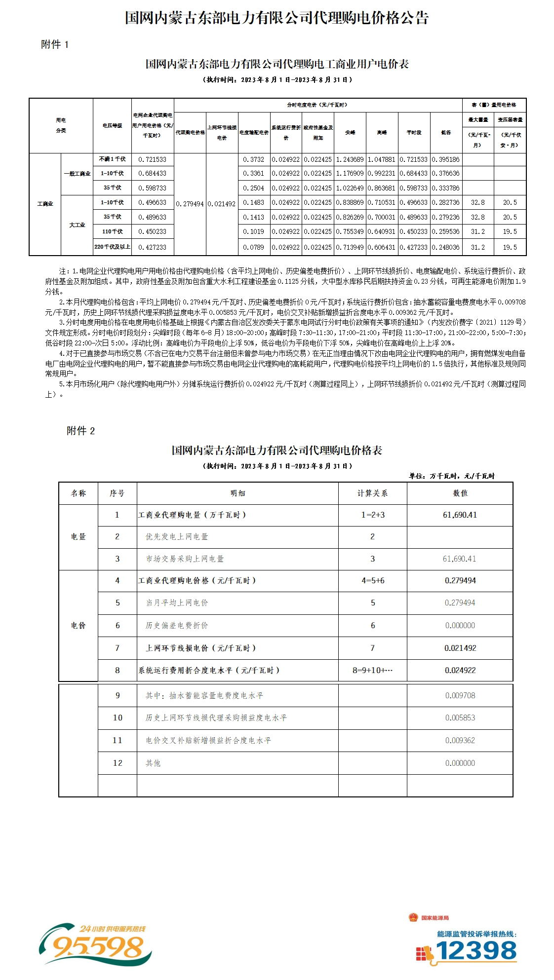 內(nèi)蒙古(蒙東)8月份代理購電工商業(yè)用戶電價(jià)表