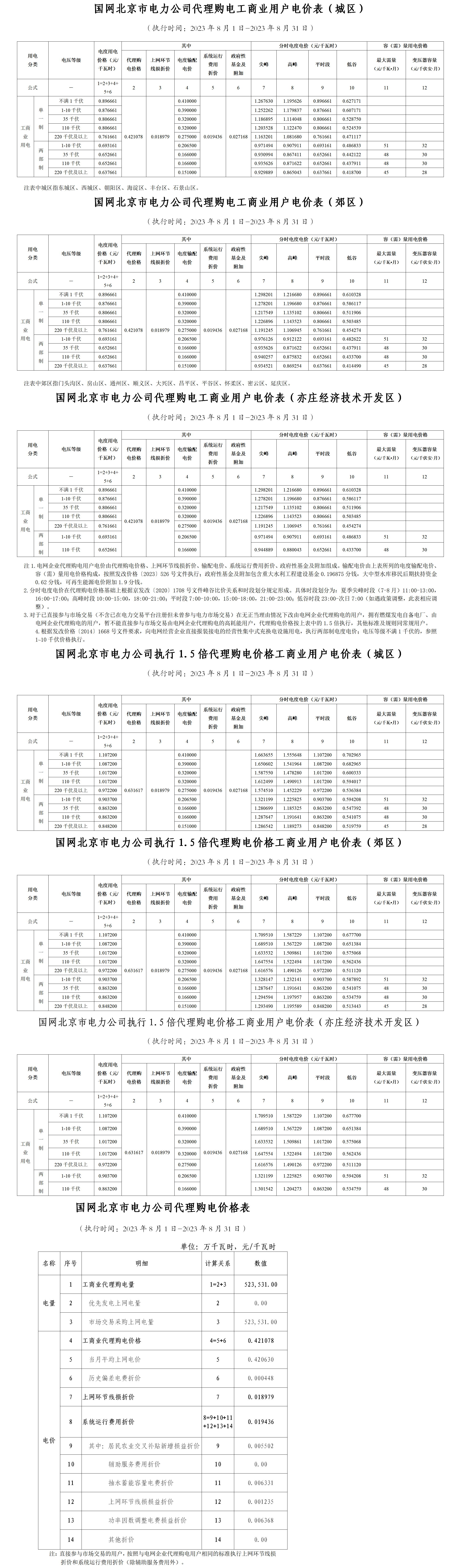 北京市8月份代理購(gòu)電工商業(yè)用戶電價(jià)表