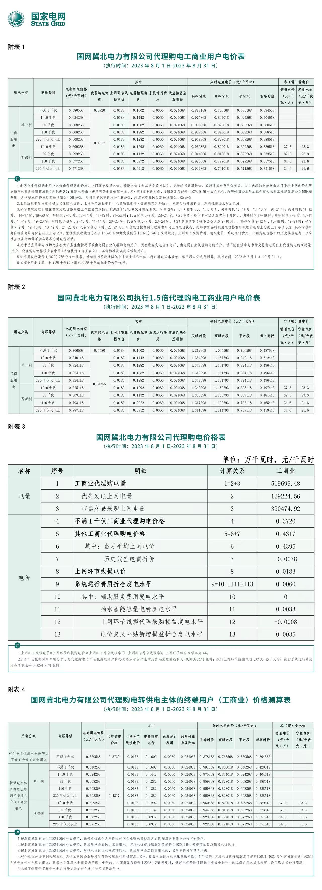 冀北地區(qū)8月份代理購(gòu)電工商業(yè)用戶電價(jià)表