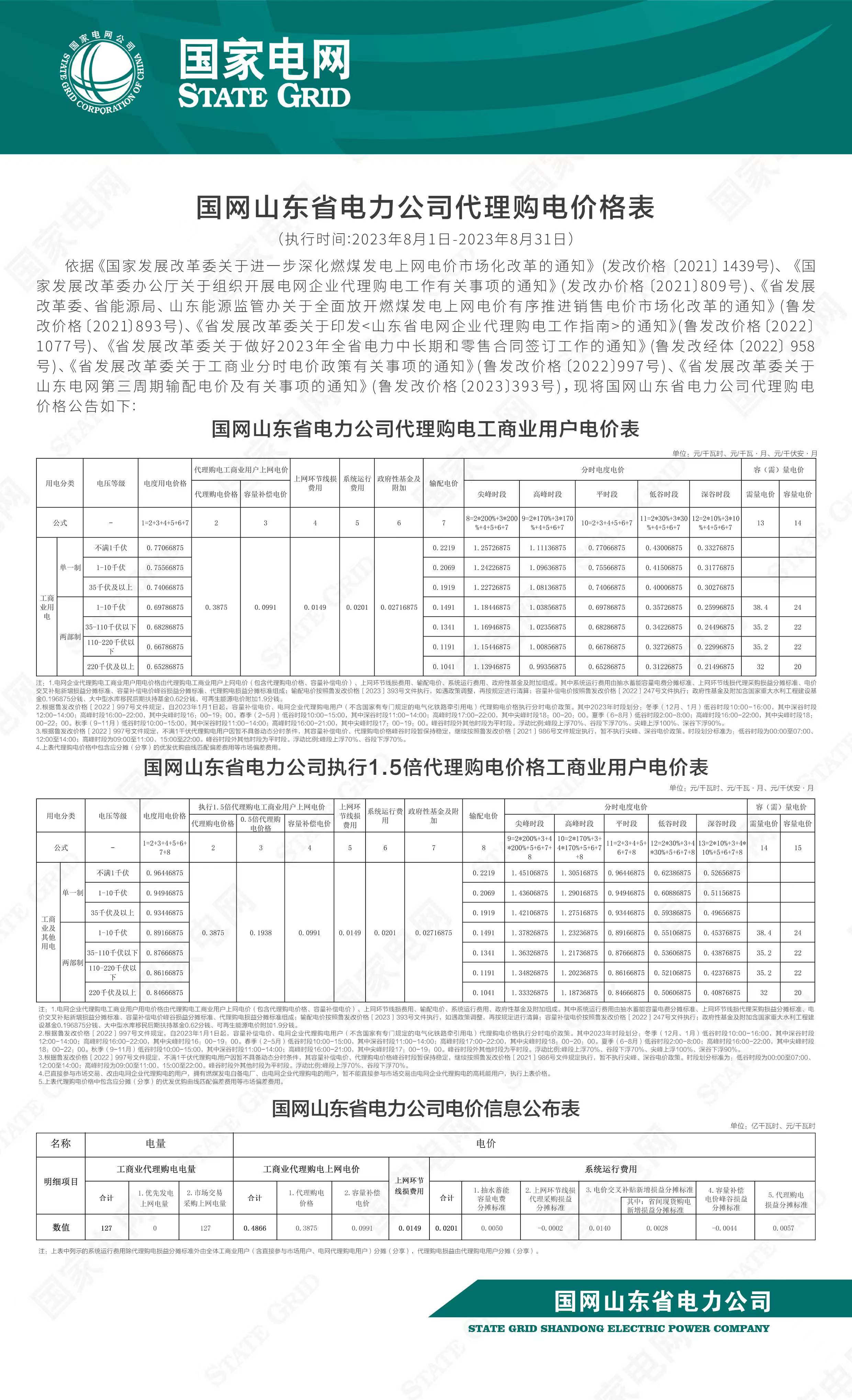 山東省8月份代理購(gòu)電工商業(yè)用戶電價(jià)表