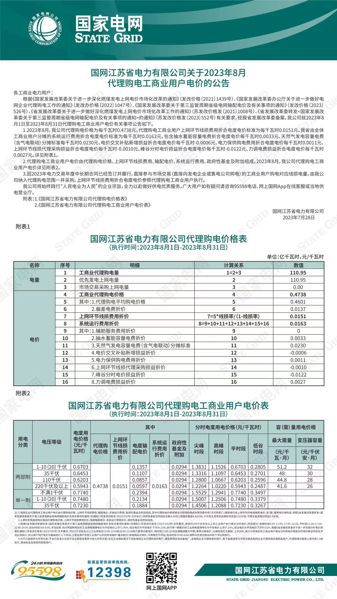 江蘇省8月份代理購電工商業(yè)用戶電價表