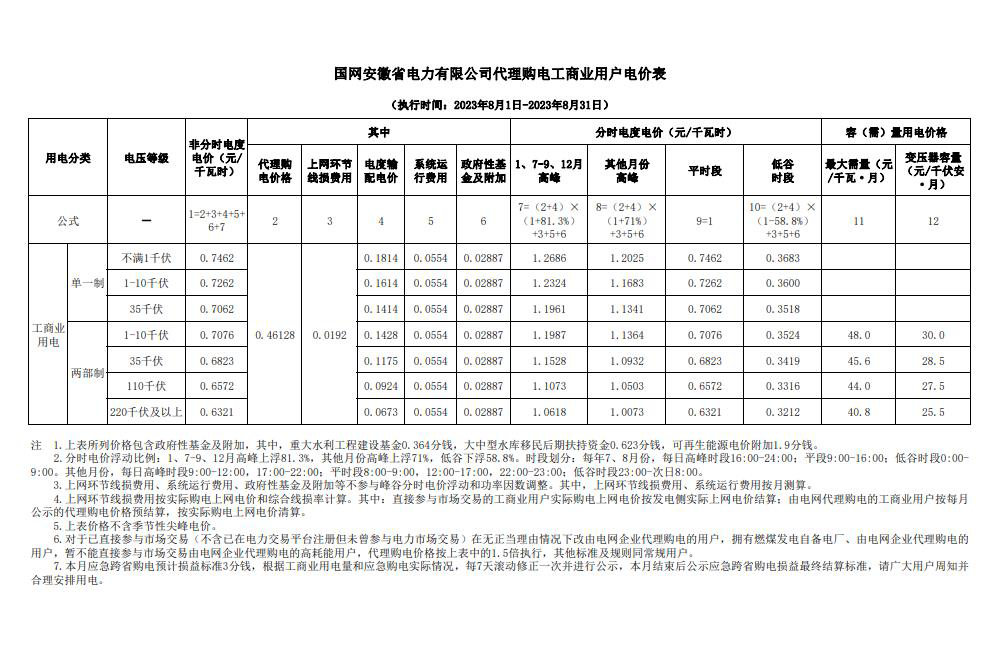安徽省8月份代理購電工商業(yè)用戶電價表
