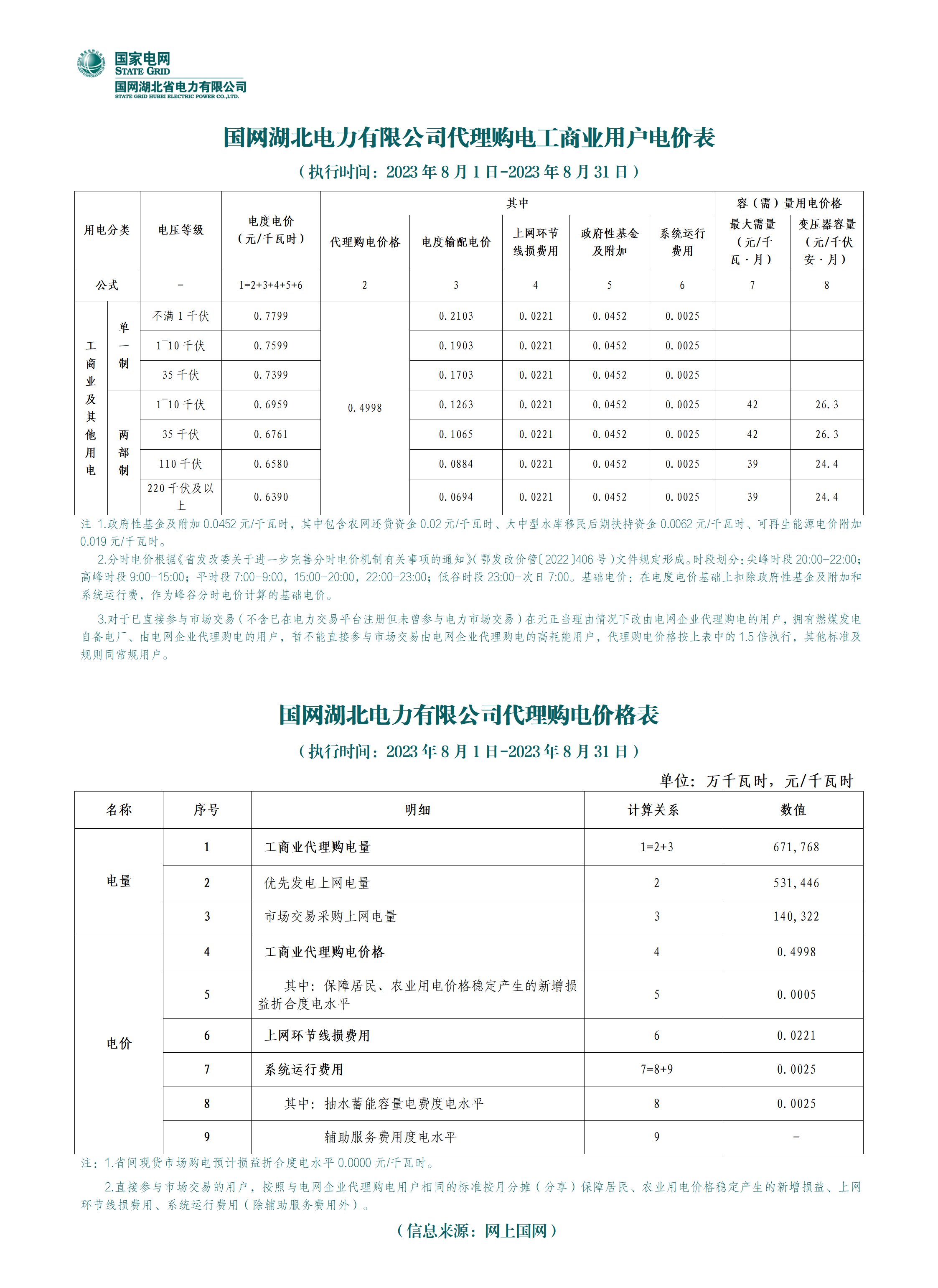 湖北省8月份代理購電工商業(yè)用戶電價表