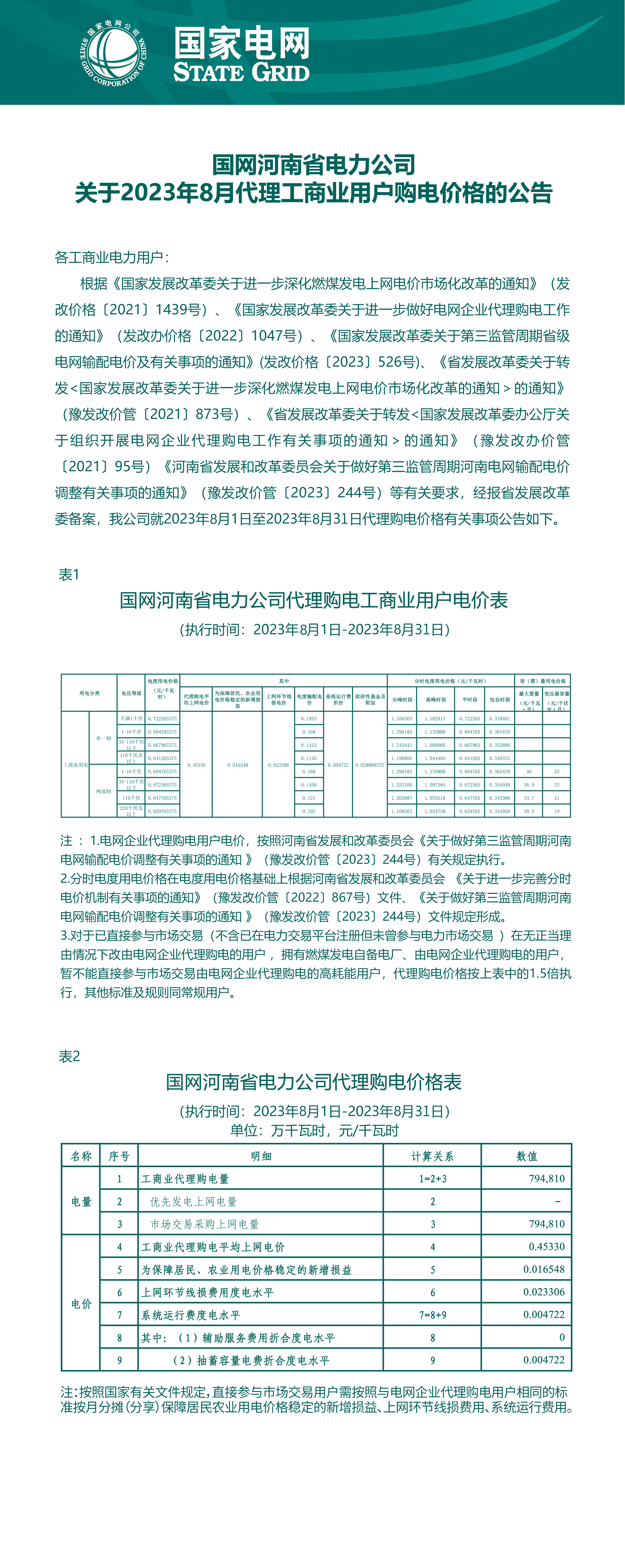 河南省8月份代理購電工商業(yè)用戶電價表