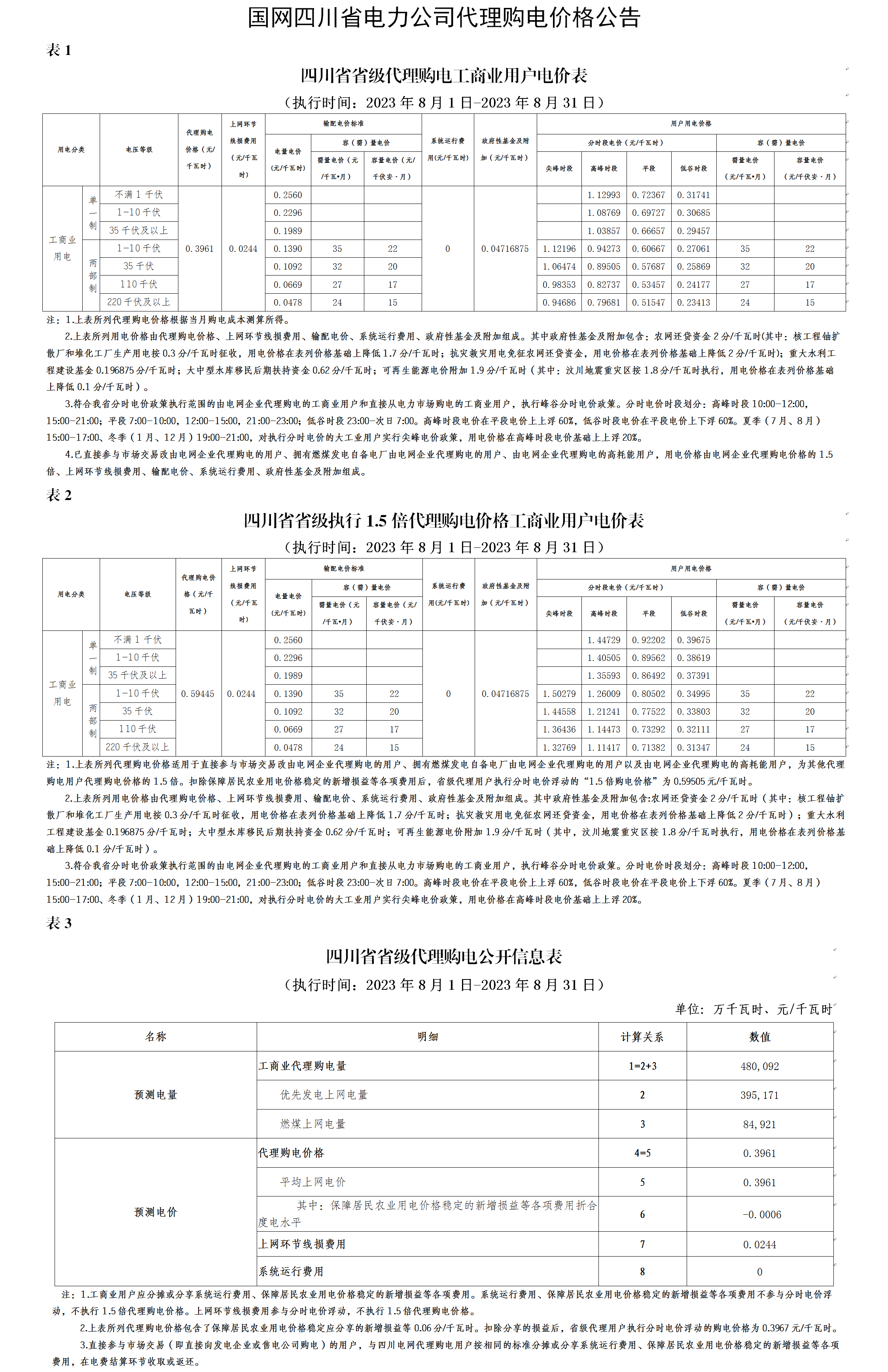 四川省8月份代理購電工商業(yè)用戶電價(jià)表