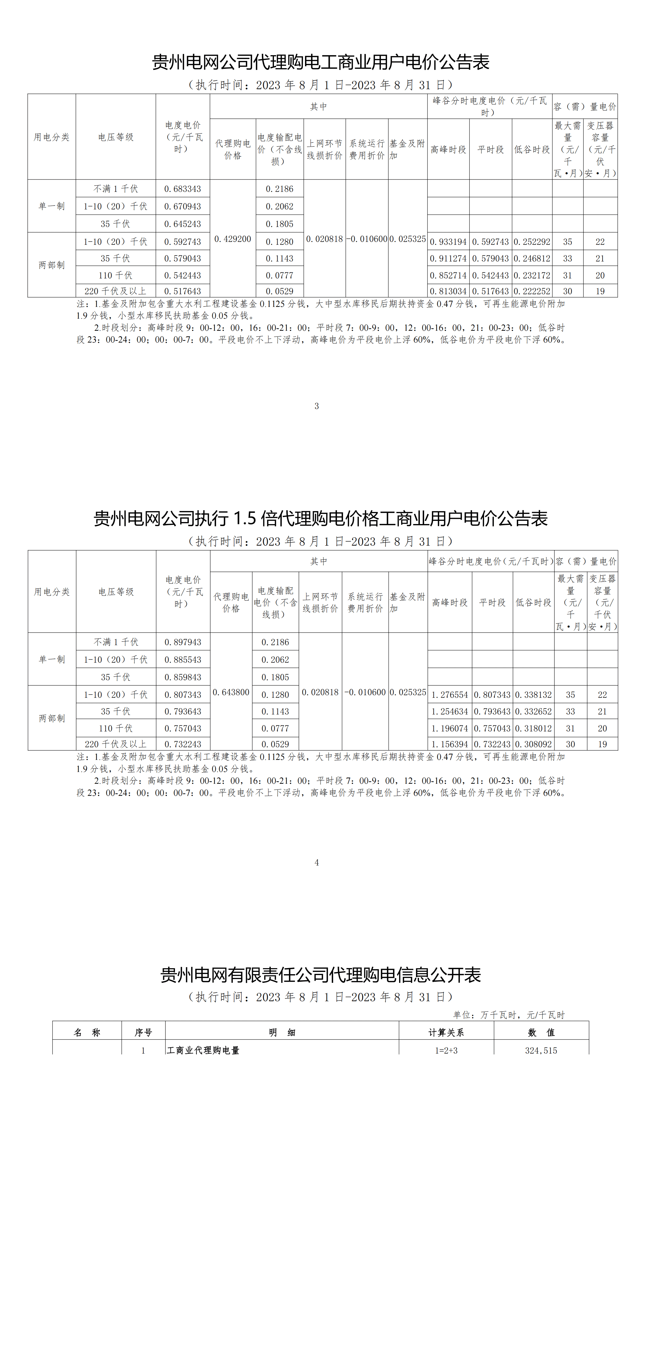 貴州省8月份代理購電工商業(yè)用戶電價表