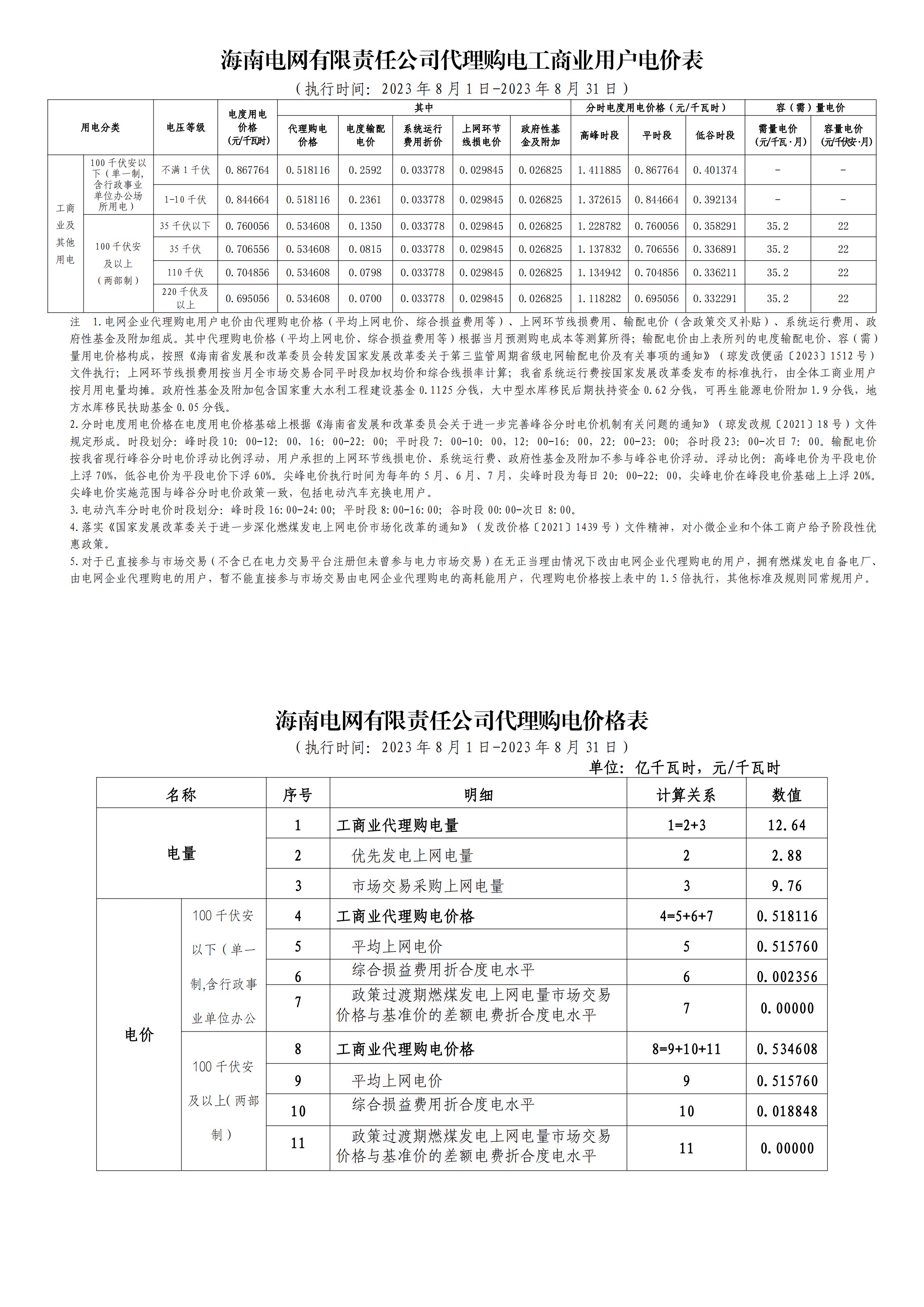 海南省8月份代理購電工商業(yè)用戶電價表