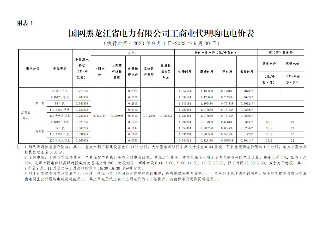 黑龍江省9月份代理購電工商業(yè)用戶電價表
