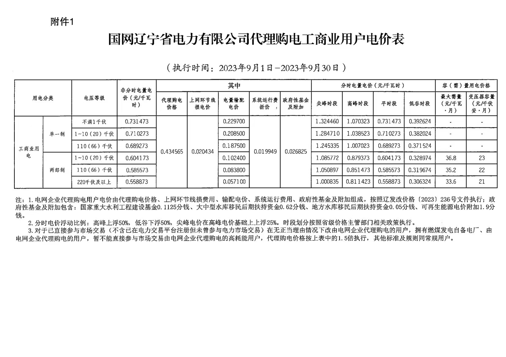 遼寧省9月份代理購電工商業(yè)用戶電價表