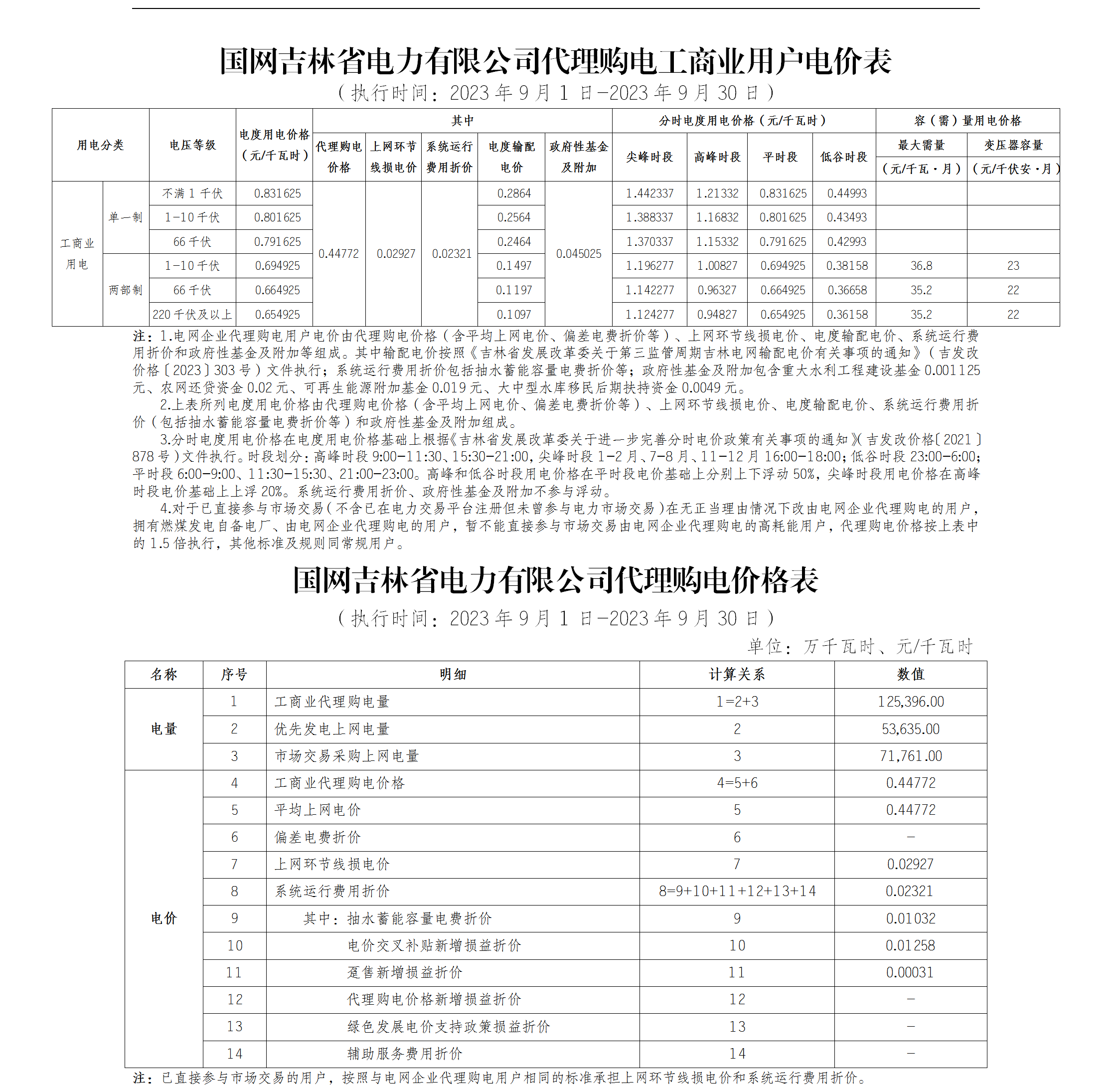 吉林省9月份代理購電工商業(yè)用戶電價表