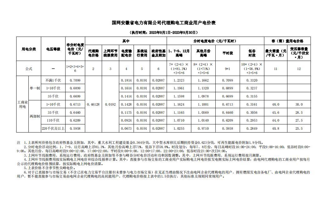 安徽省9月份代理購電工商業(yè)用戶電價(jià)表