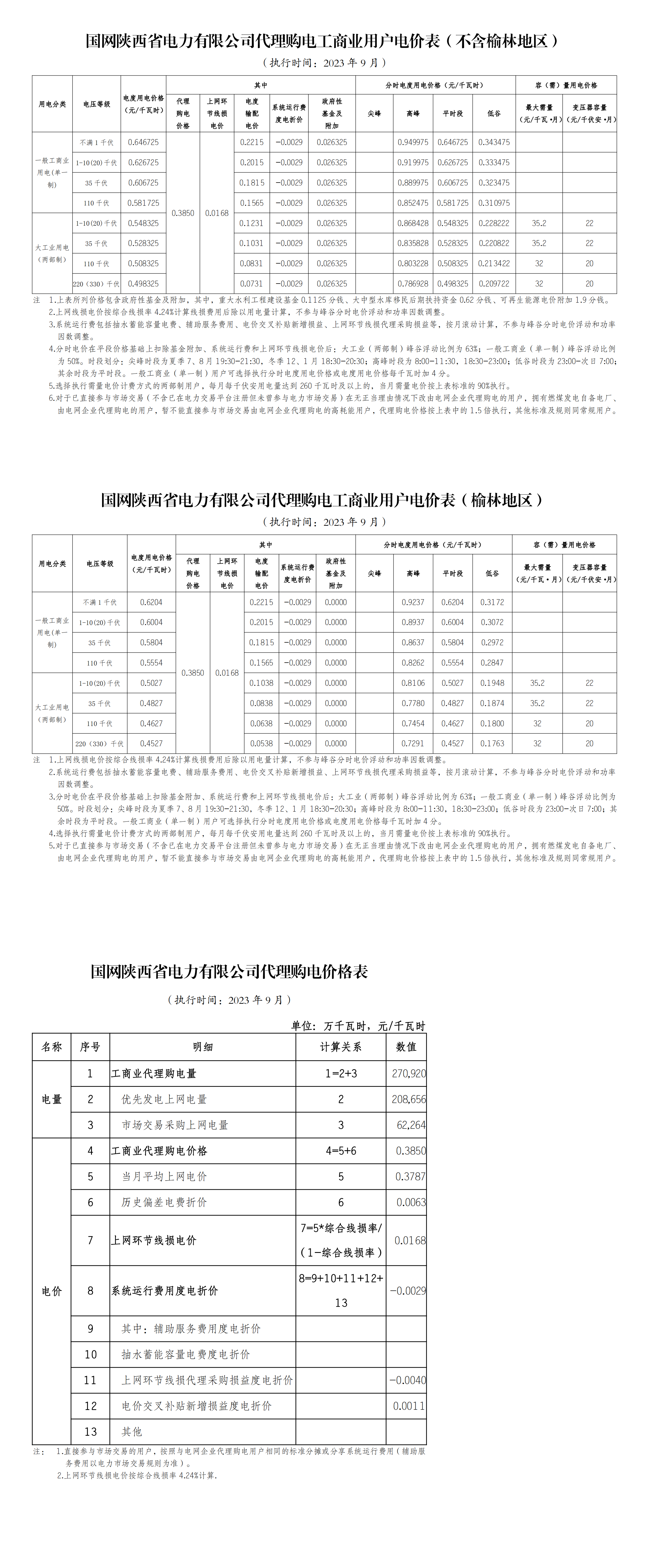 陜西省9月份代理購(gòu)電工商業(yè)用戶電價(jià)表