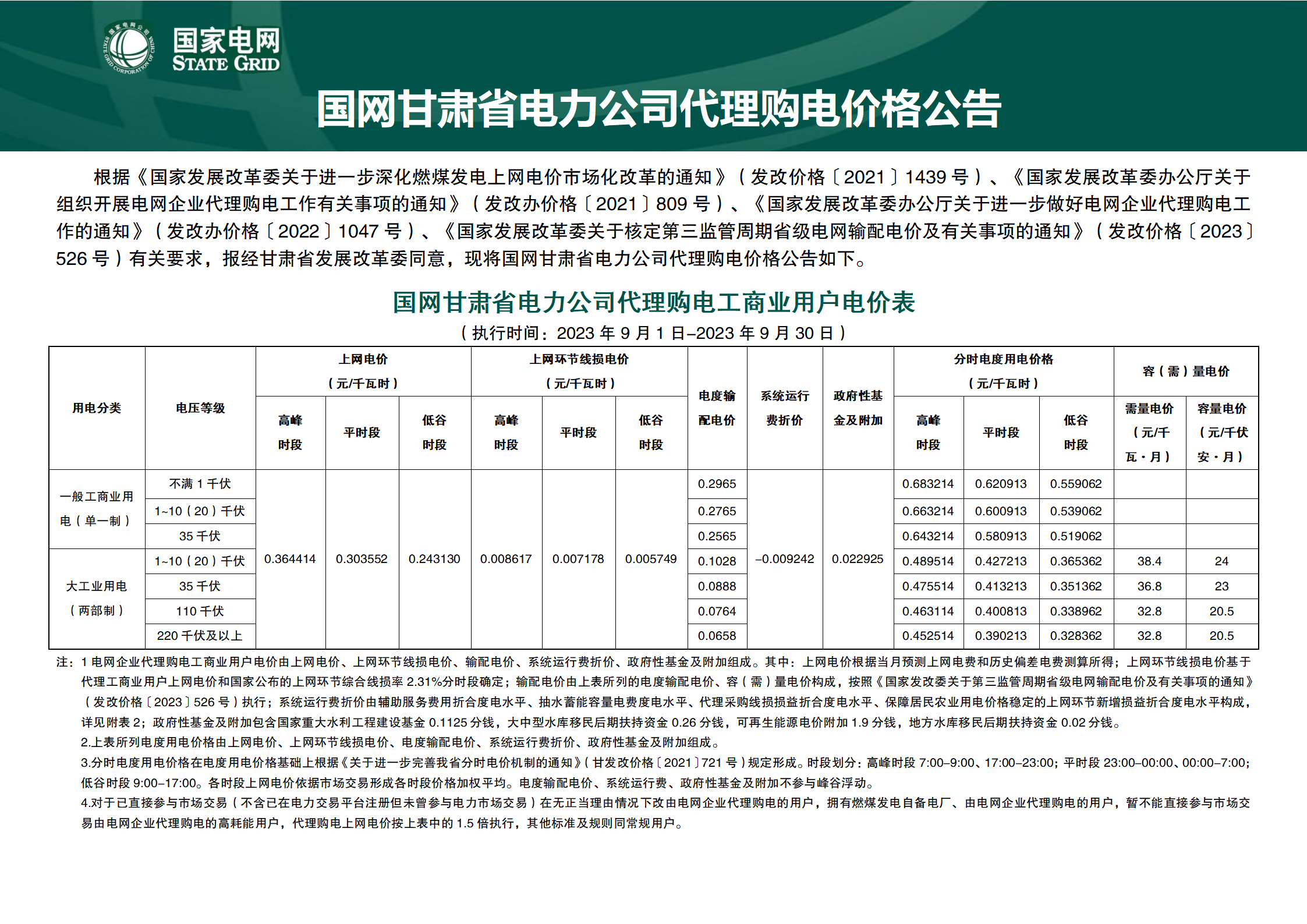 甘肅省9月份代理購(gòu)電工商業(yè)用戶電價(jià)表