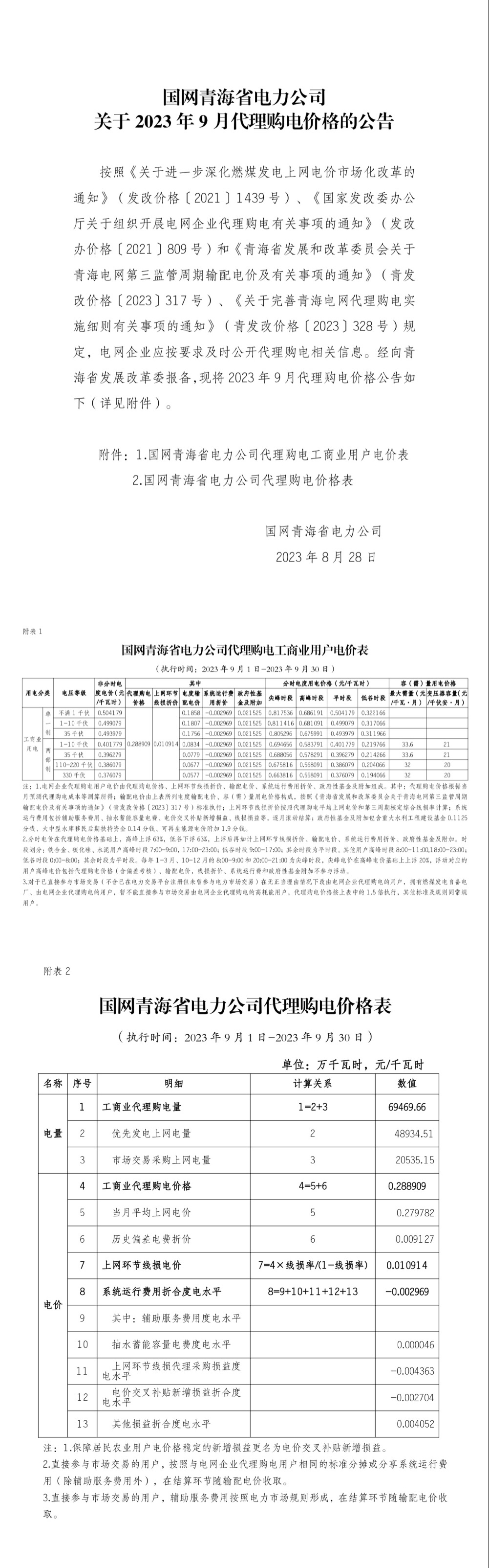 青海省9月份代理購(gòu)電工商業(yè)用戶電價(jià)表