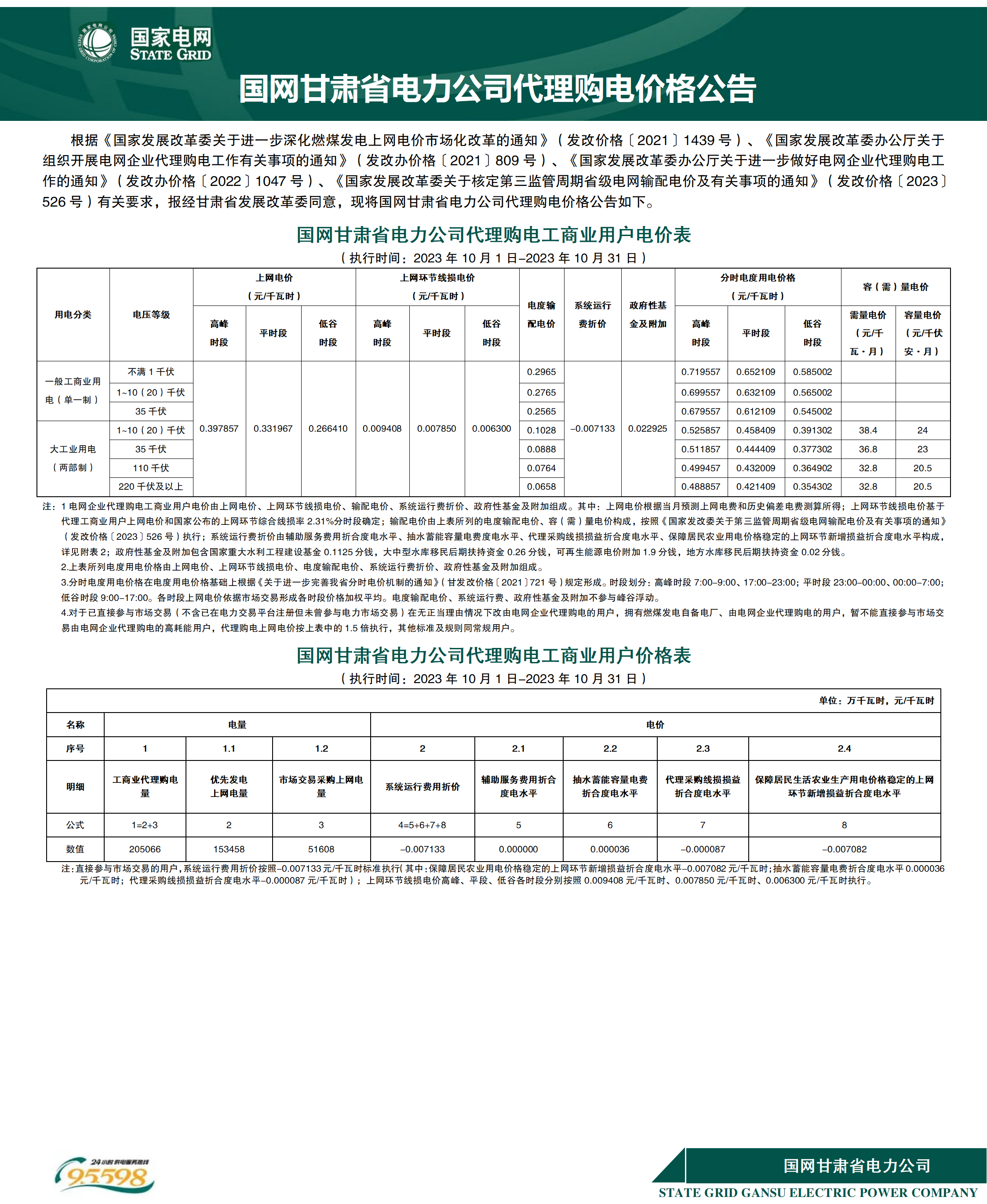 甘肅省10月份代理購電工商業(yè)用戶電價(jià)表