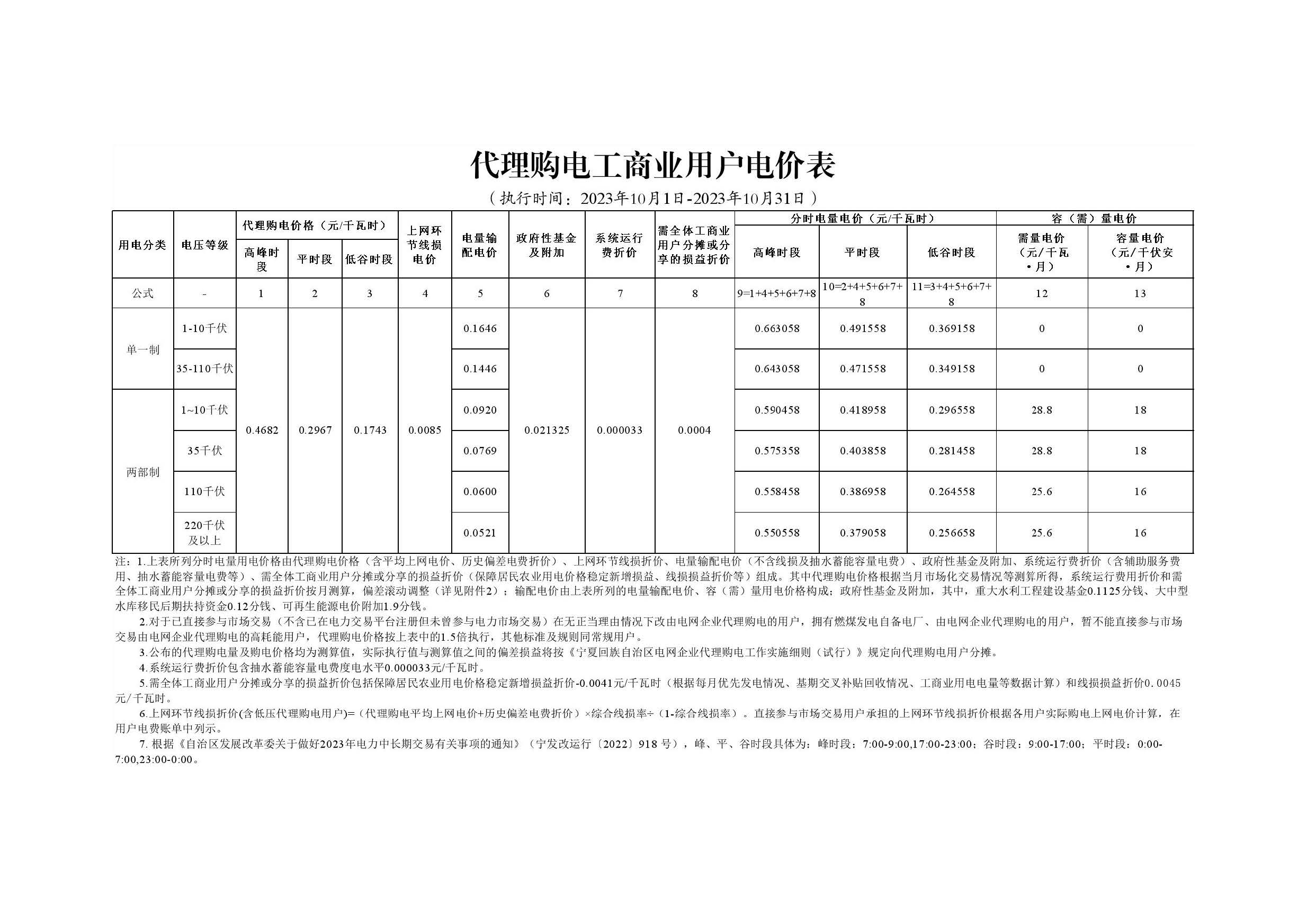 寧夏10月份代理購電工商業(yè)用戶電價(jià)表