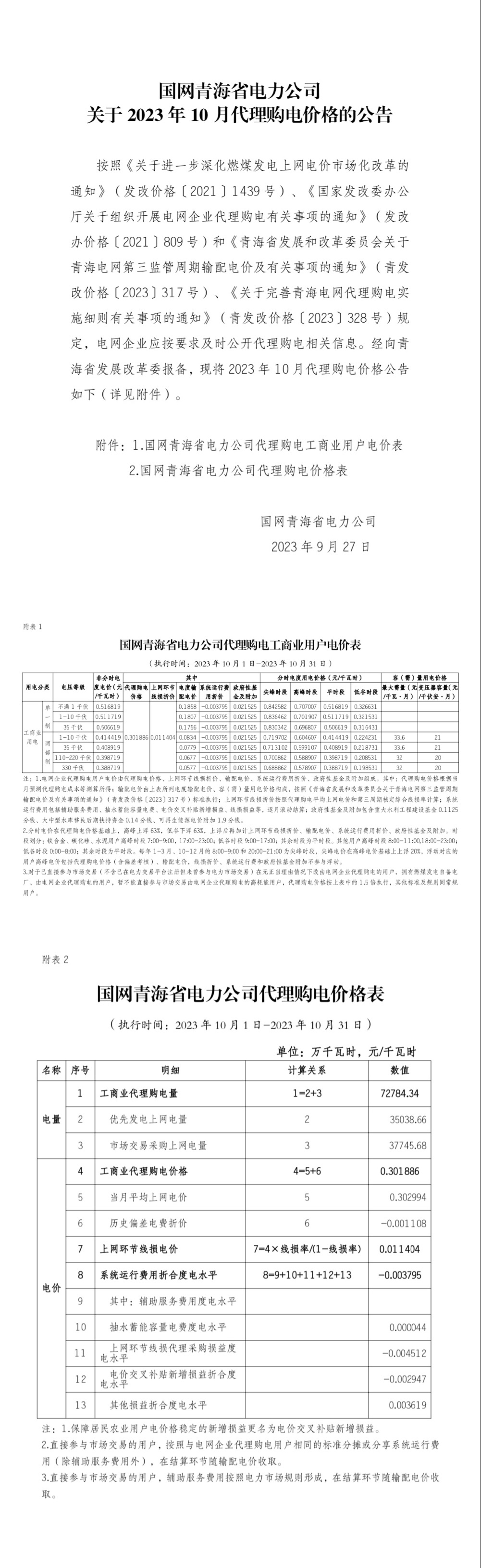 青海省10月份代理購電工商業(yè)用戶電價(jià)表