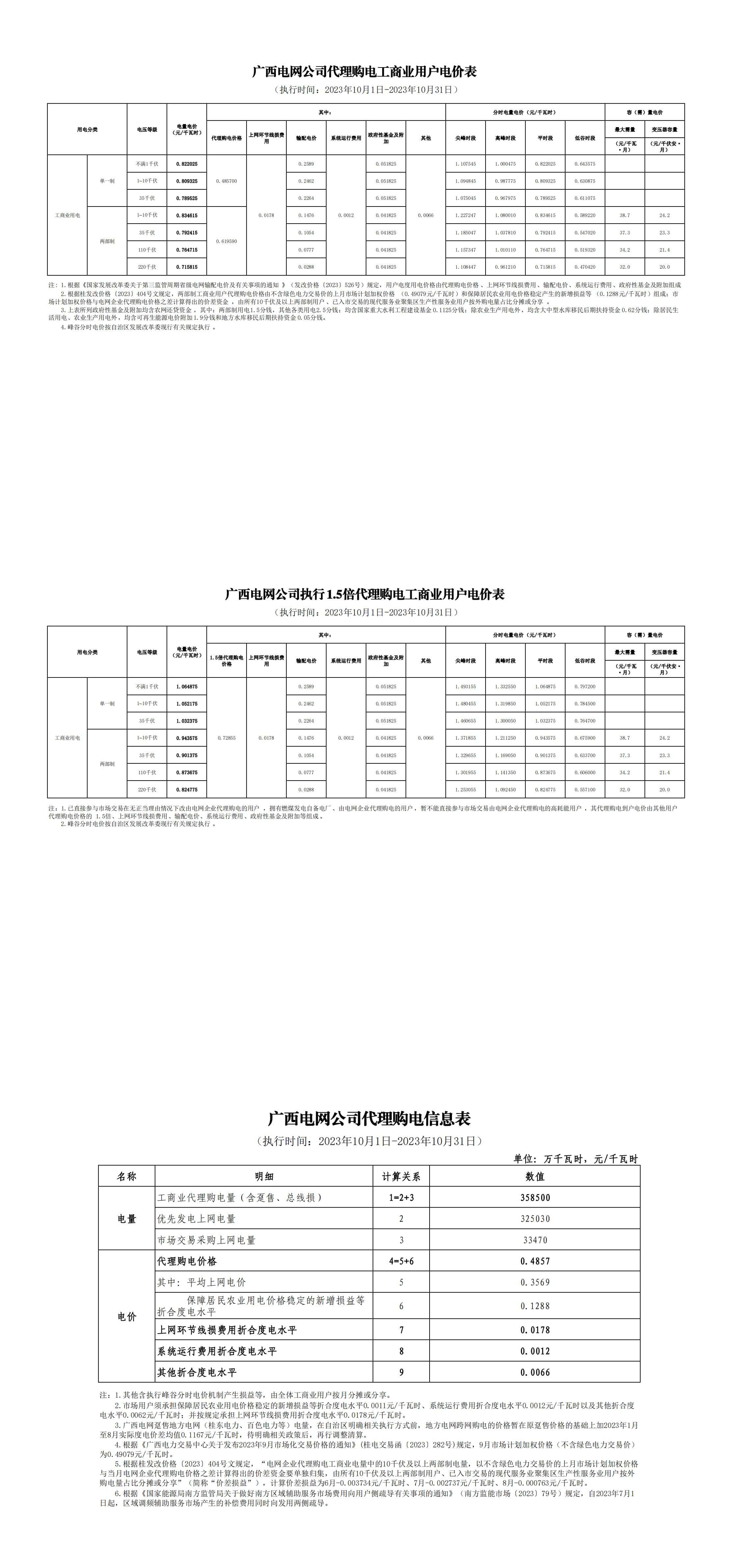 廣西省10月份代理購(gòu)電工商業(yè)用戶電價(jià)表