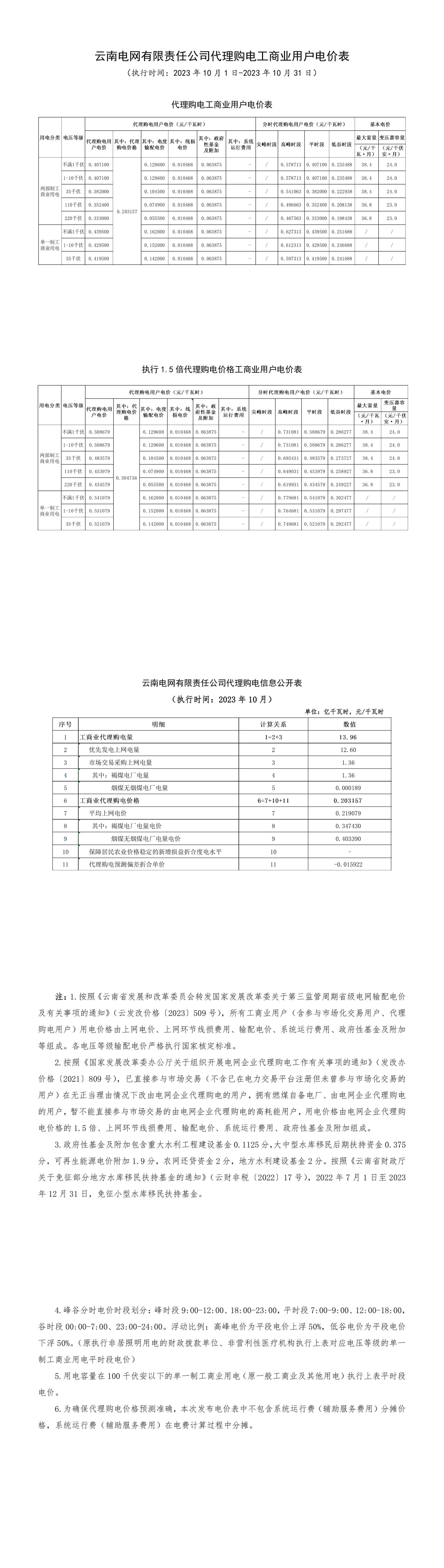 云南省10月份代理購(gòu)電工商業(yè)用戶電價(jià)表