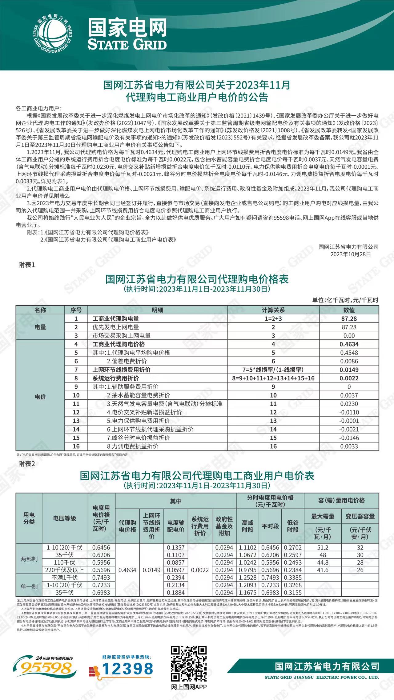 江蘇省11月份代理購(gòu)電工商業(yè)用戶電價(jià)表