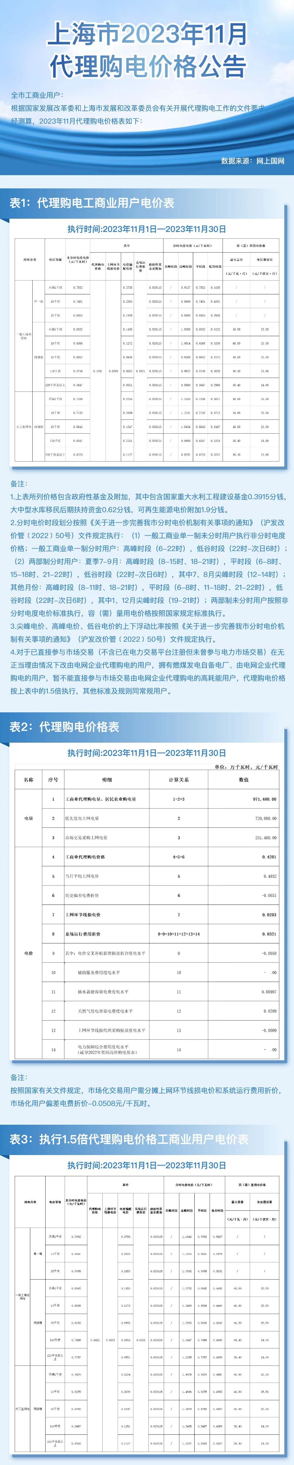 上海市11月份代理購(gòu)電工商業(yè)用戶電價(jià)表