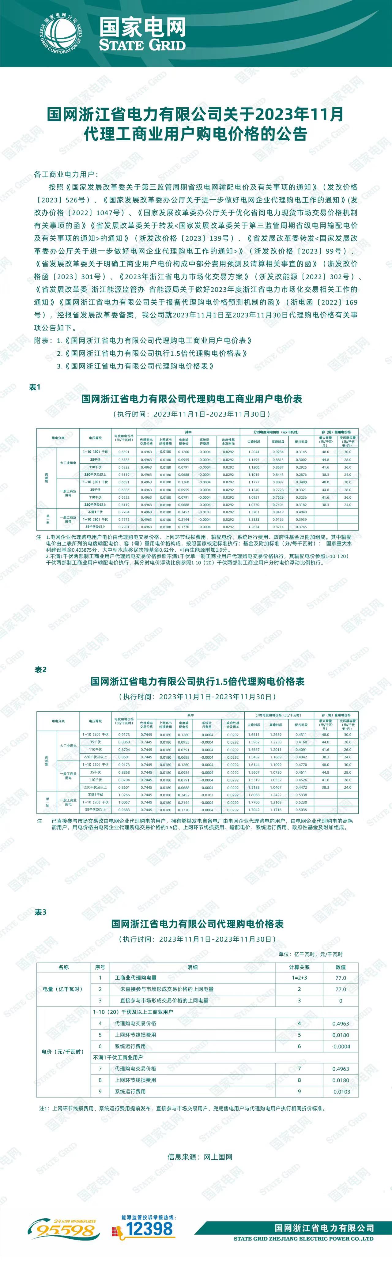 浙江省11月份代理購(gòu)電工商業(yè)用戶電價(jià)表