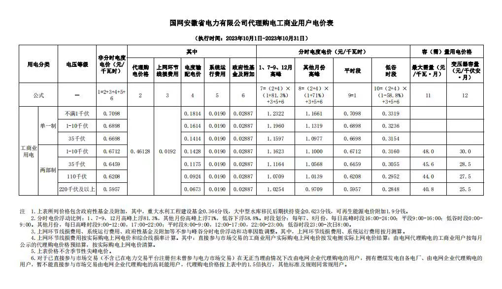 安徽省11月份代理購(gòu)電工商業(yè)用戶電價(jià)表