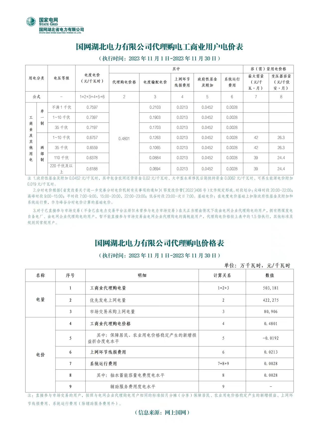 湖北省11月份代理購(gòu)電工商業(yè)用戶電價(jià)表