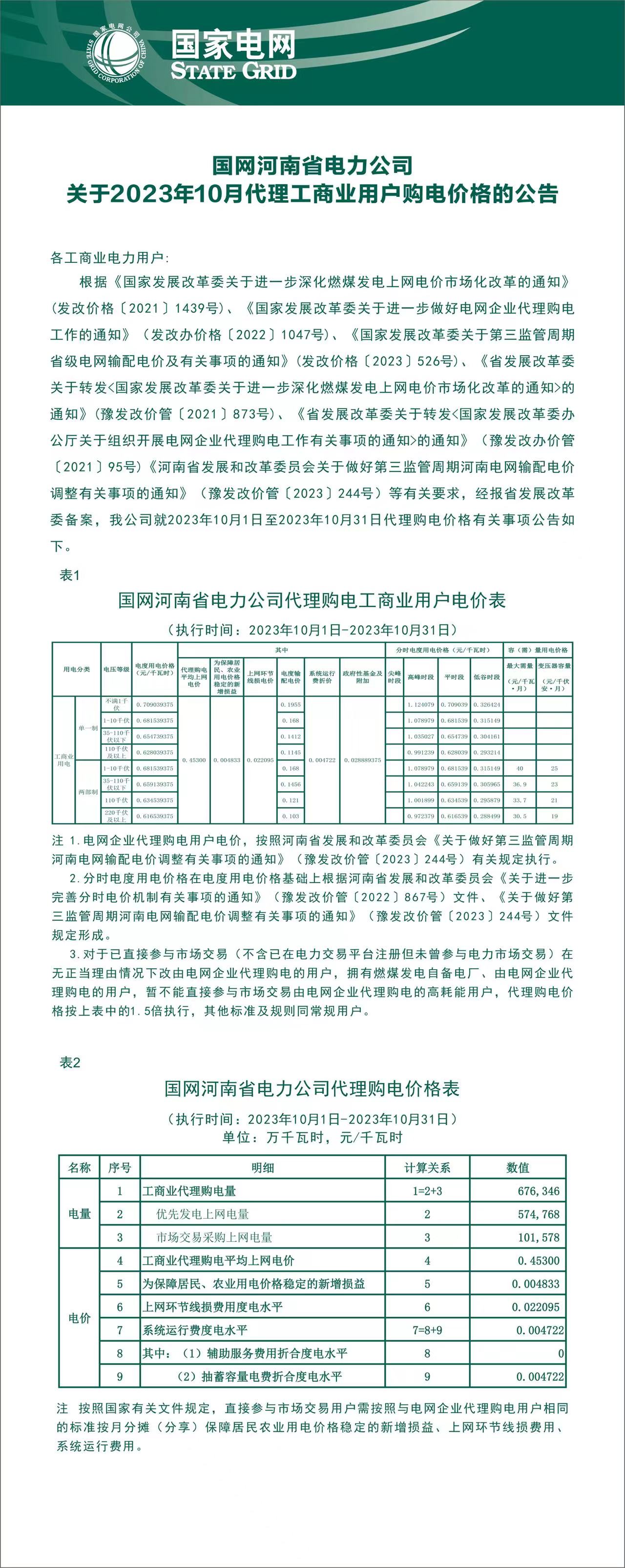 河南省11月份代理購(gòu)電工商業(yè)用戶電價(jià)表