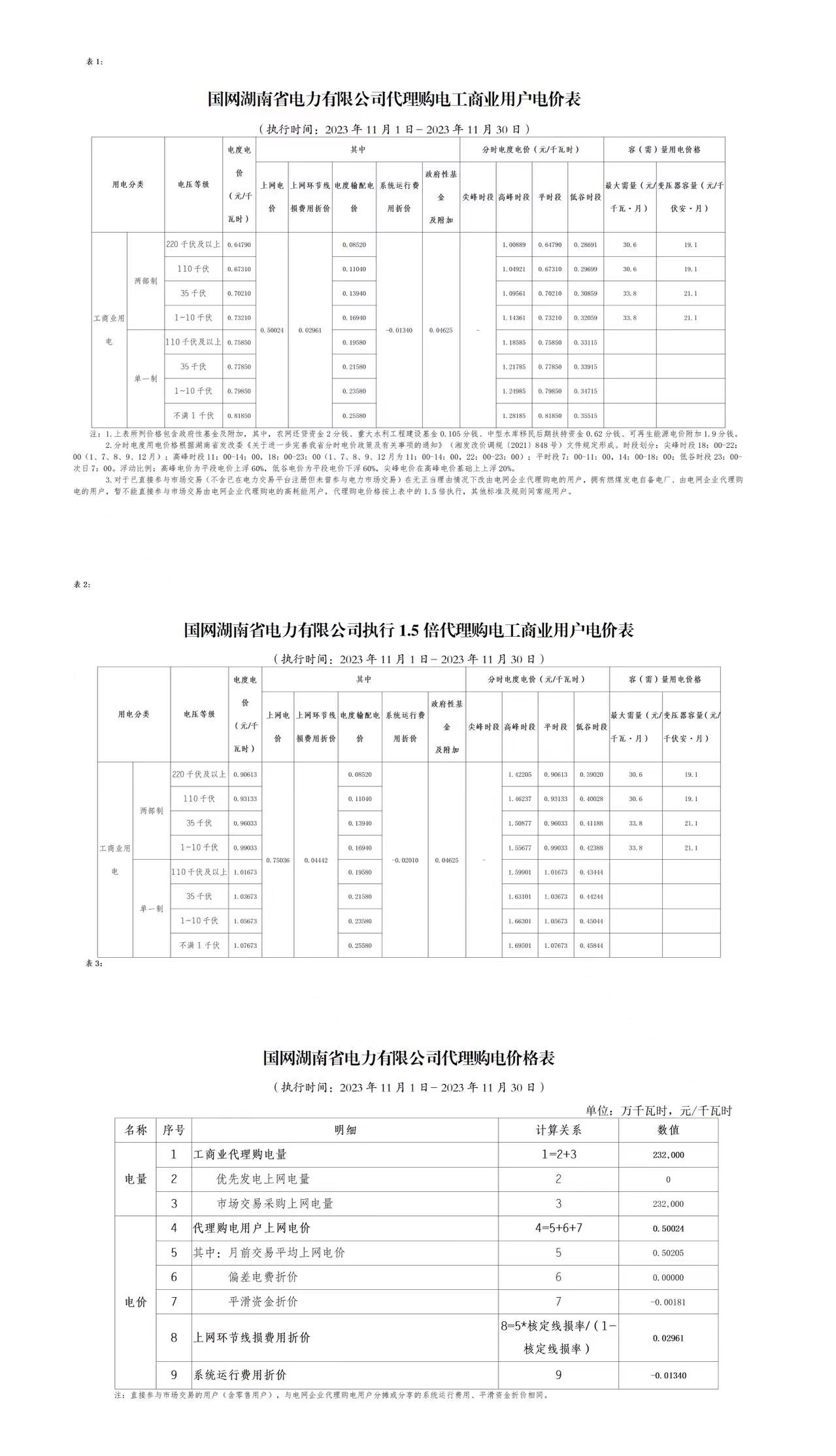 湖南省11月份代理購(gòu)電工商業(yè)用戶電價(jià)表