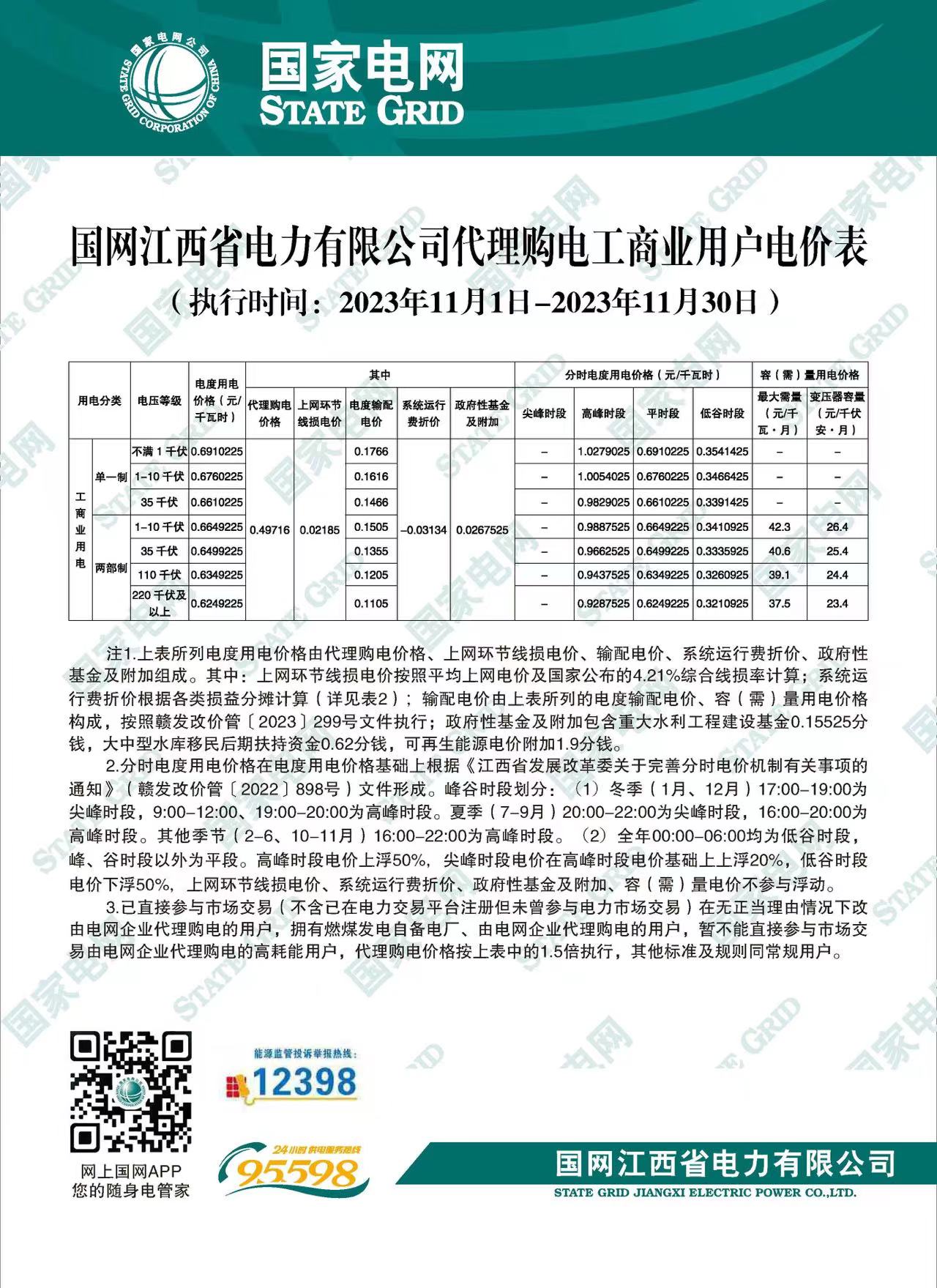 江西省11月份代理購(gòu)電工商業(yè)用戶電價(jià)表