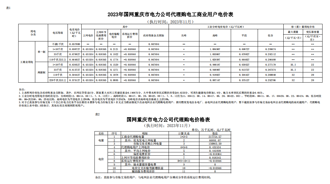 重慶市11月份代理購(gòu)電工商業(yè)用戶電價(jià)表