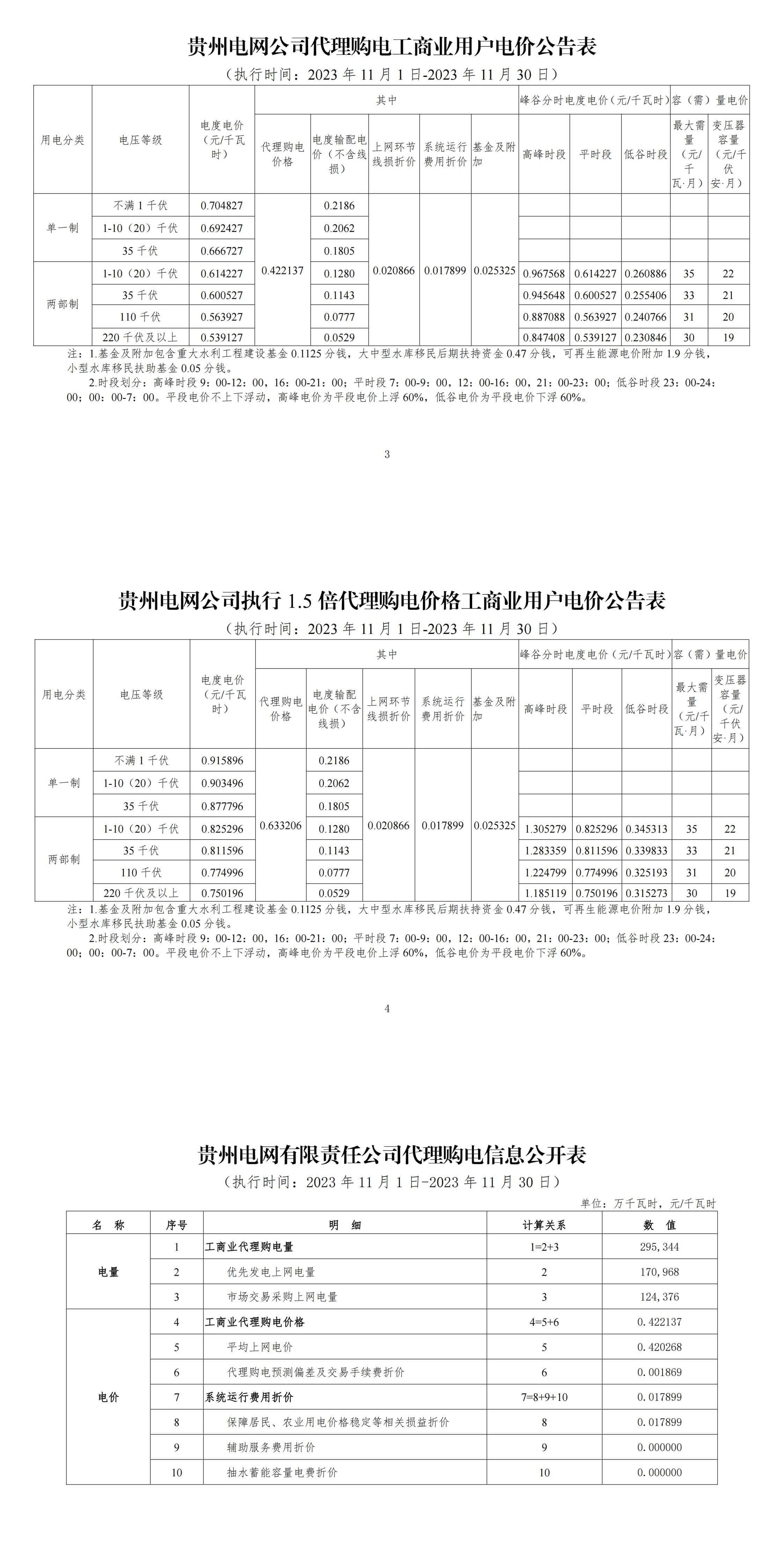 貴州省11月份代理購電工商業(yè)用戶電價表