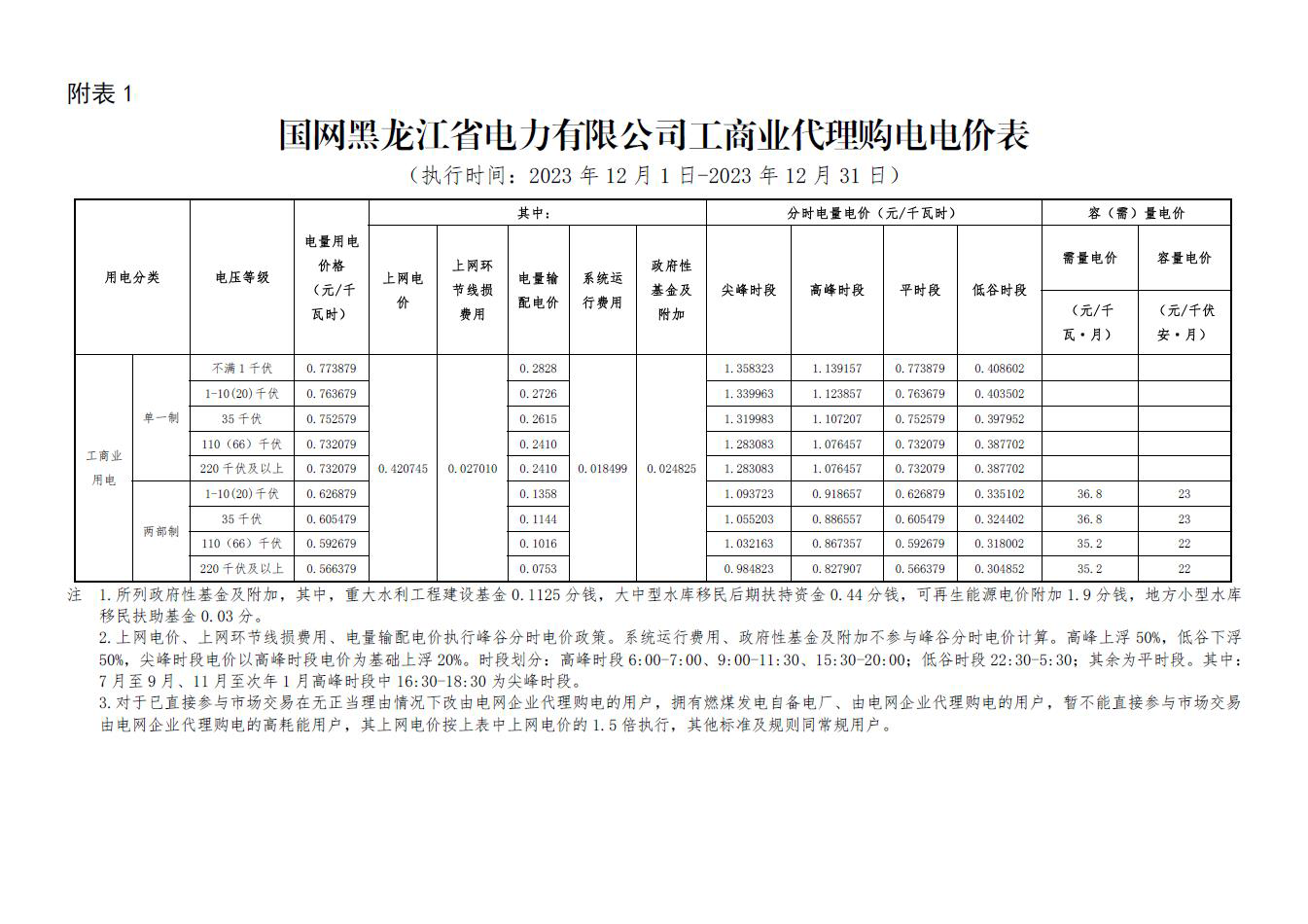 黑龍江省12月份代理購電工商業(yè)用戶電價表