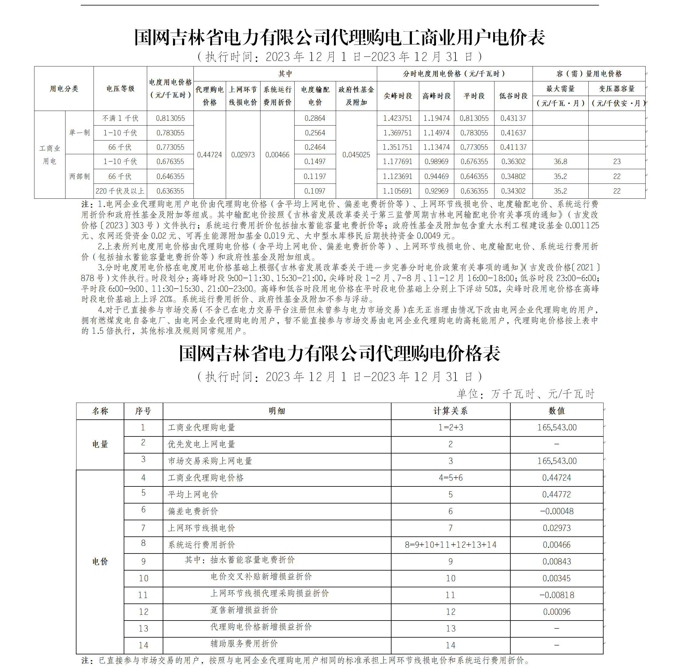 吉林省12月份代理購電工商業(yè)用戶電價表