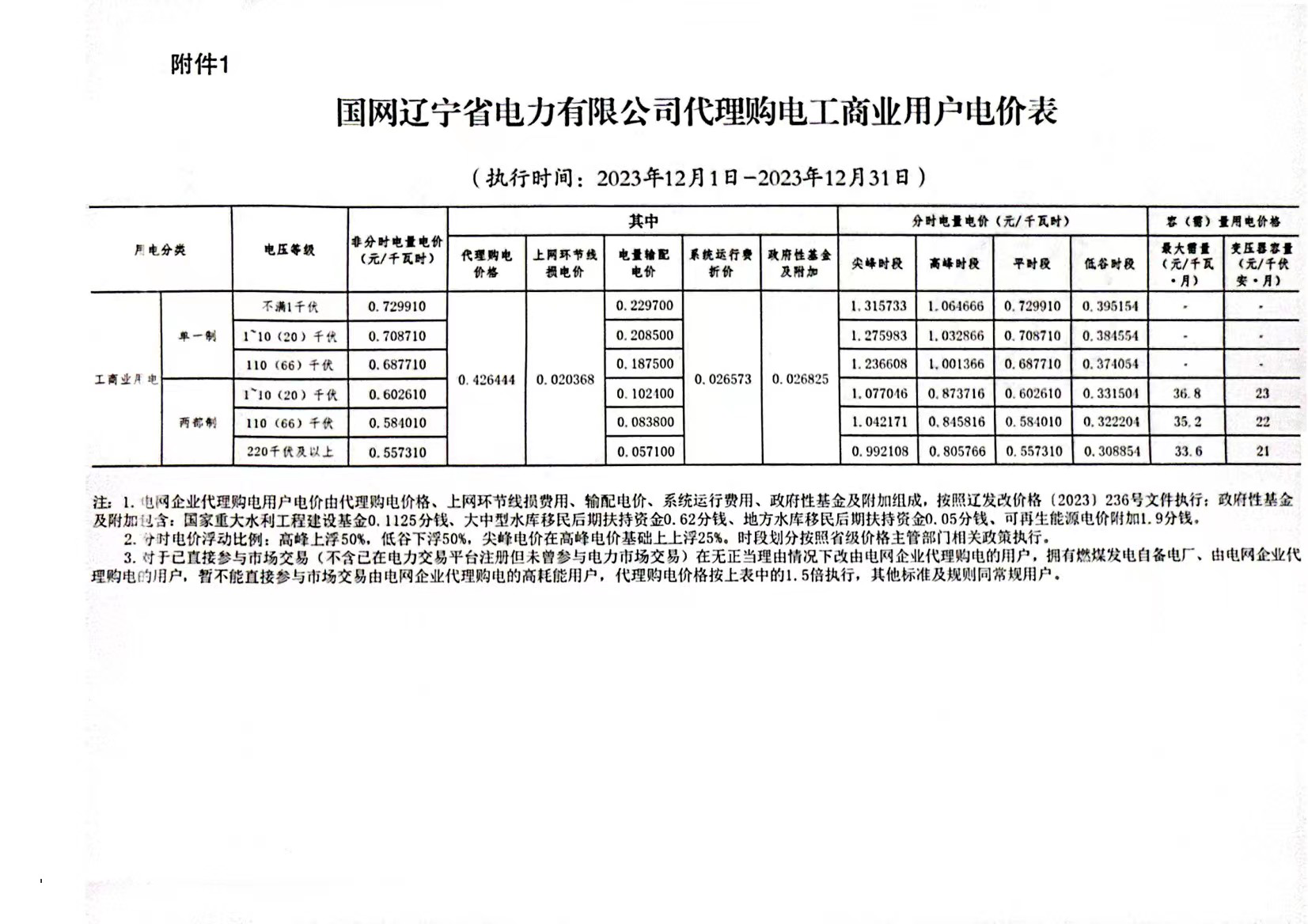 遼寧省12月份代理購電工商業(yè)用戶電價表