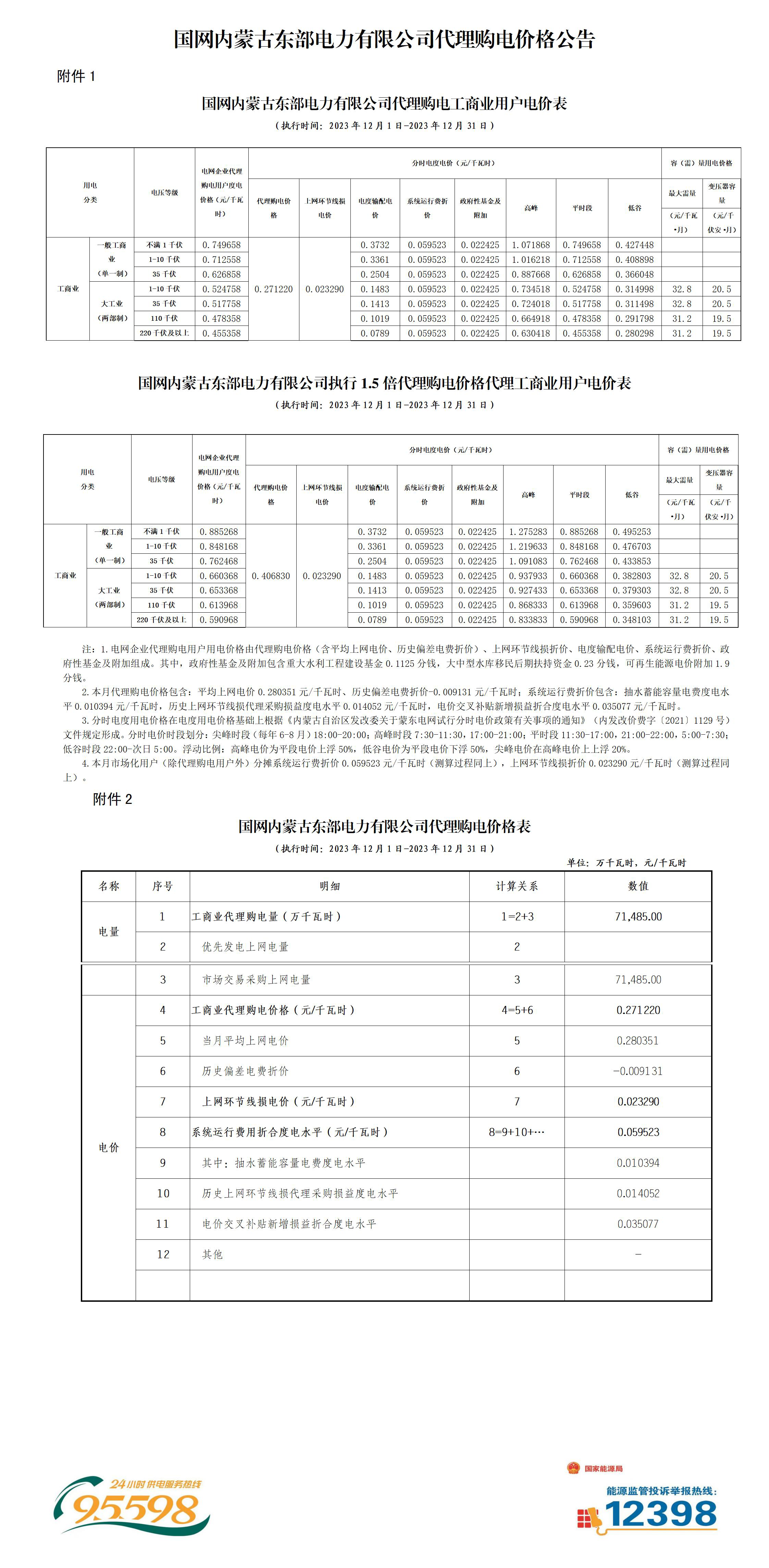 內(nèi)蒙古(蒙東)12月份代理購電工商業(yè)用戶電價表