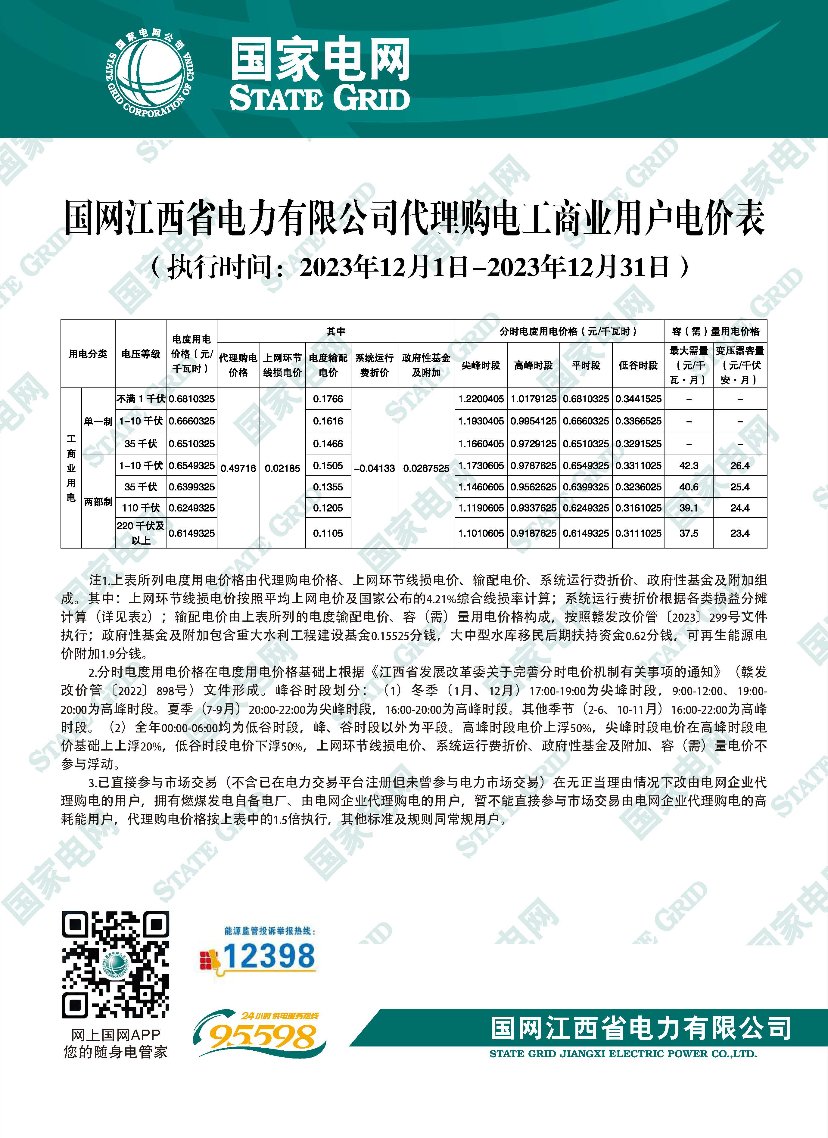 江西省12月份代理購(gòu)電工商業(yè)用戶(hù)電價(jià)表