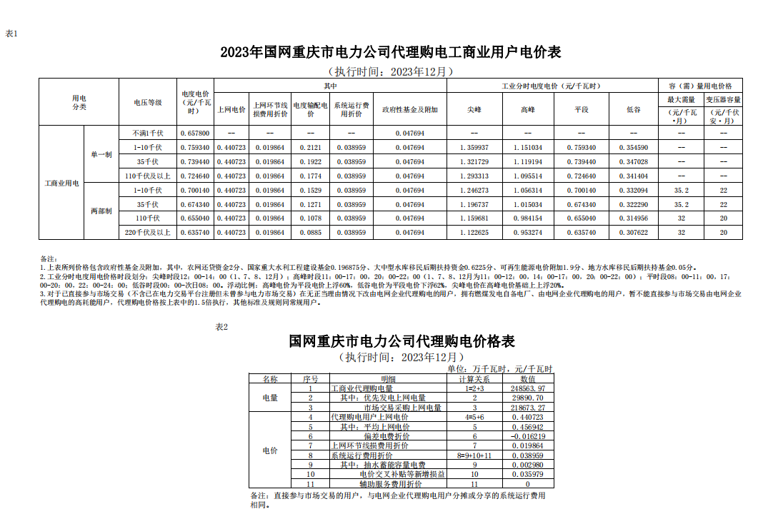 重慶市12月份代理購(gòu)電工商業(yè)用戶(hù)電價(jià)表