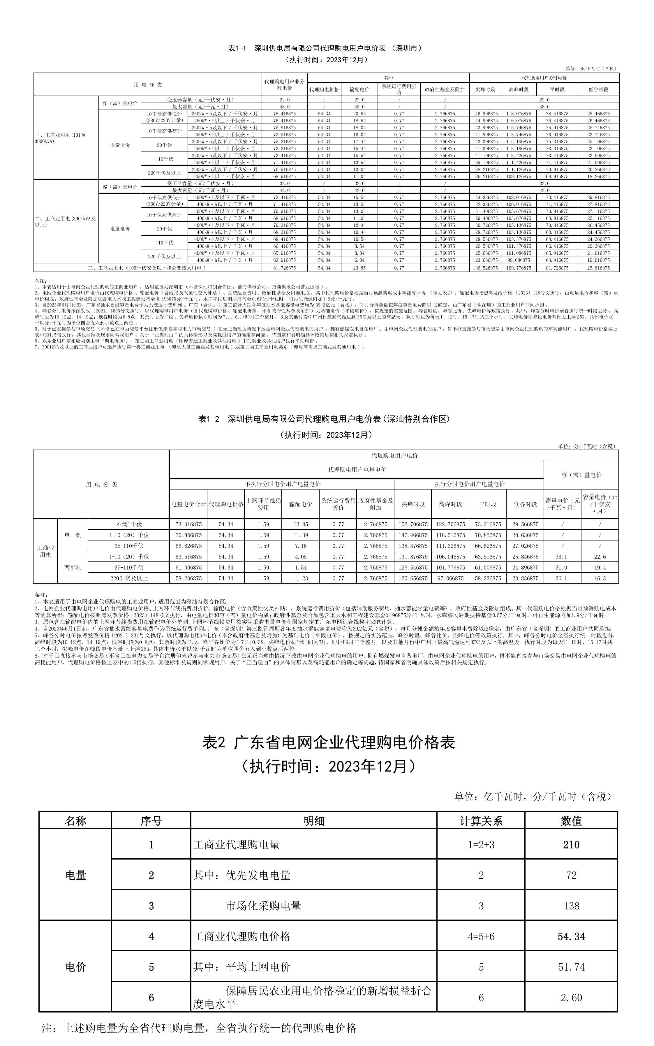 深圳市12月份代理購電工商業(yè)用戶電價(jià)表