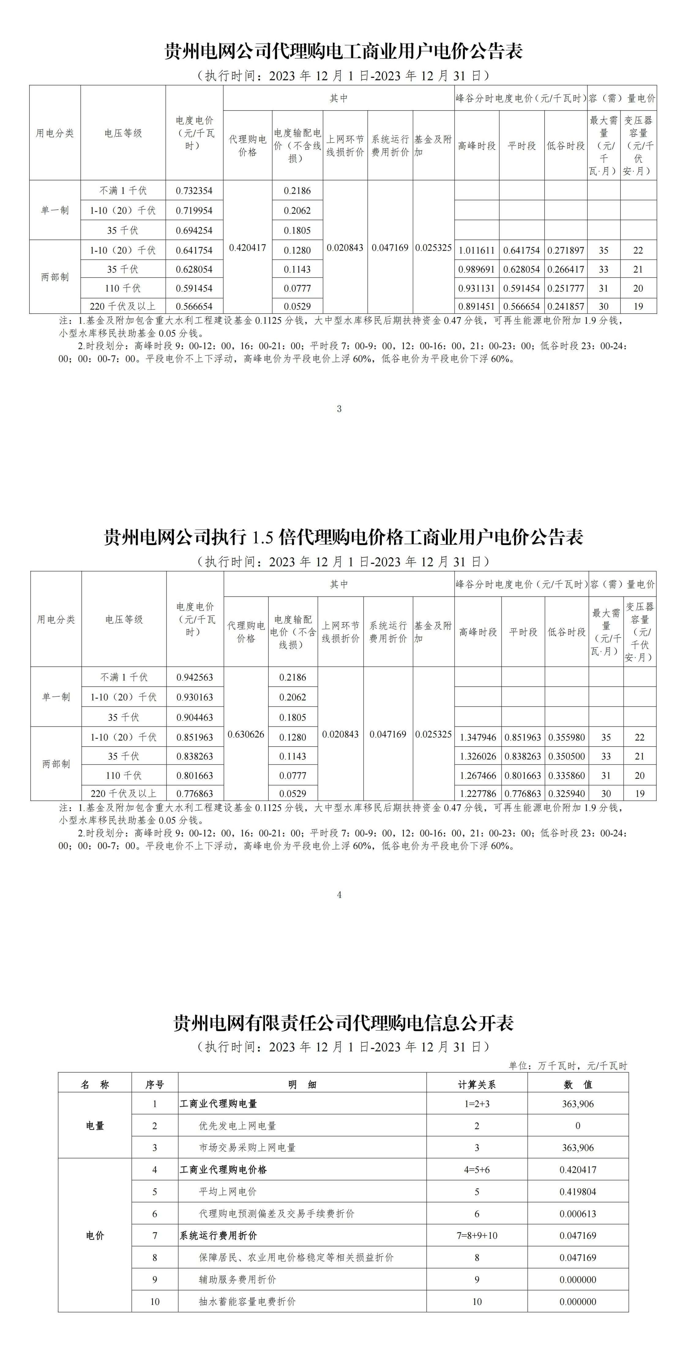 貴州省12月份代理購電工商業(yè)用戶電價(jià)表