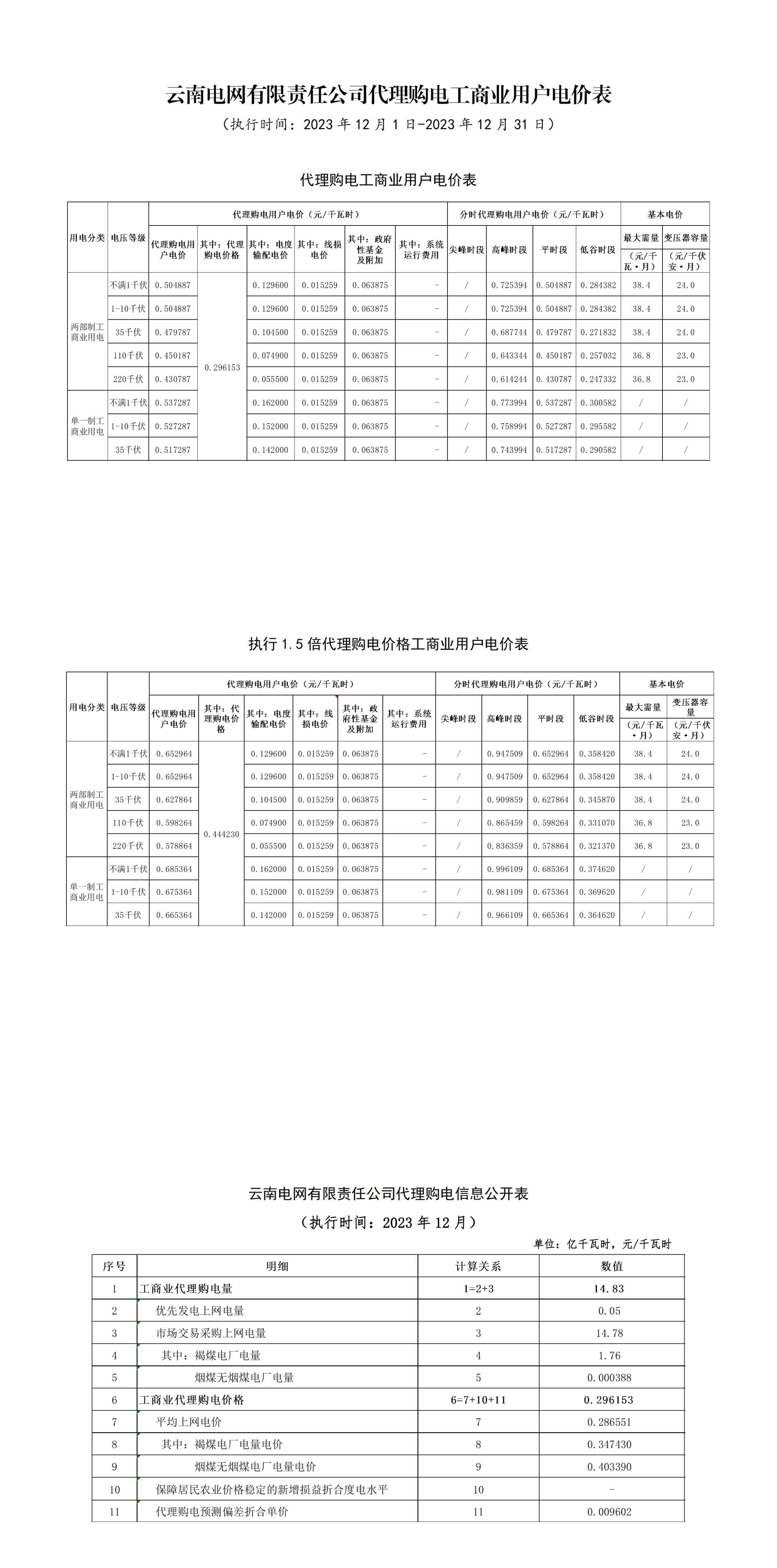 云南省12月份代理購電工商業(yè)用戶電價(jià)表