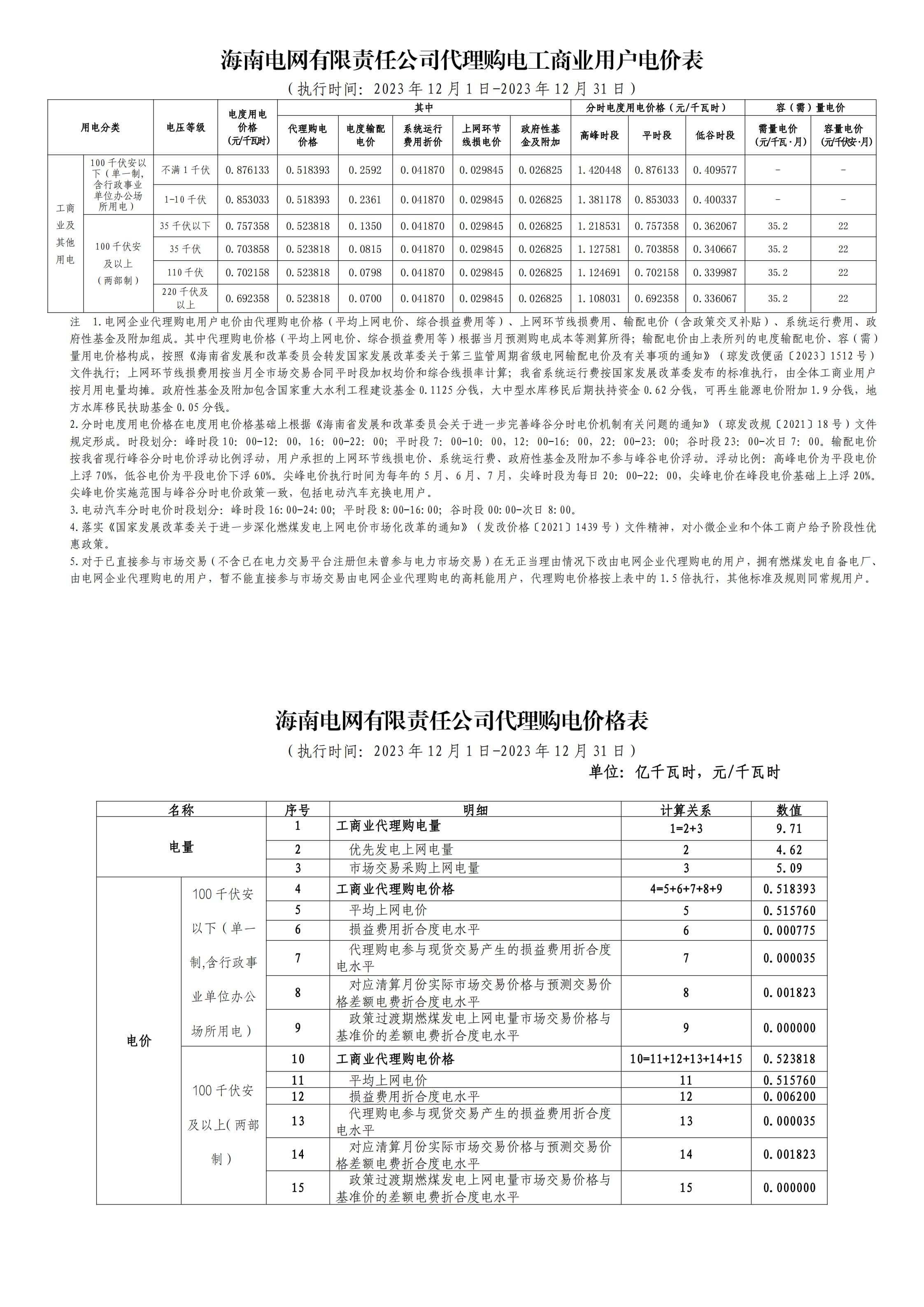 海南省12月份代理購電工商業(yè)用戶電價(jià)表