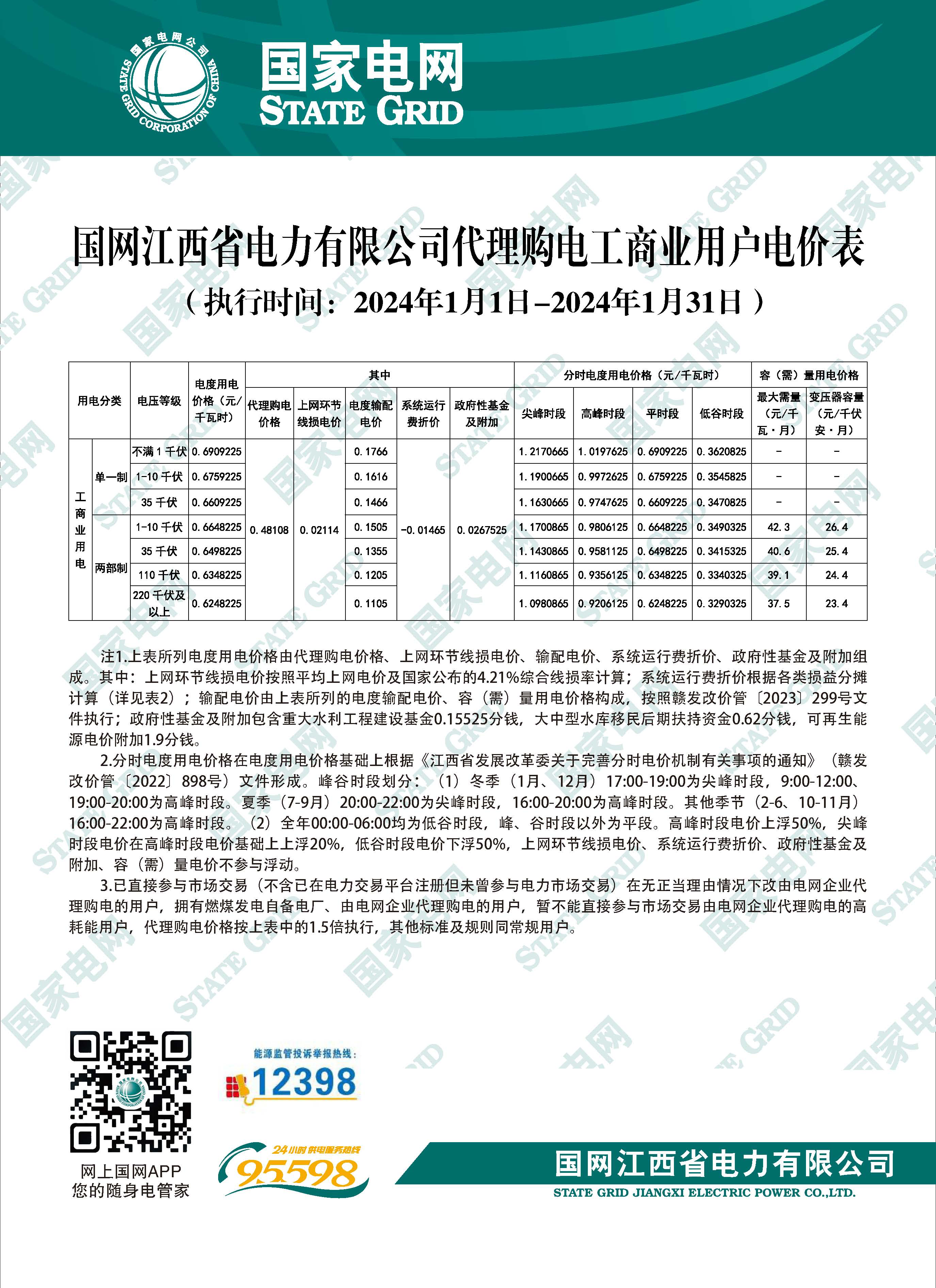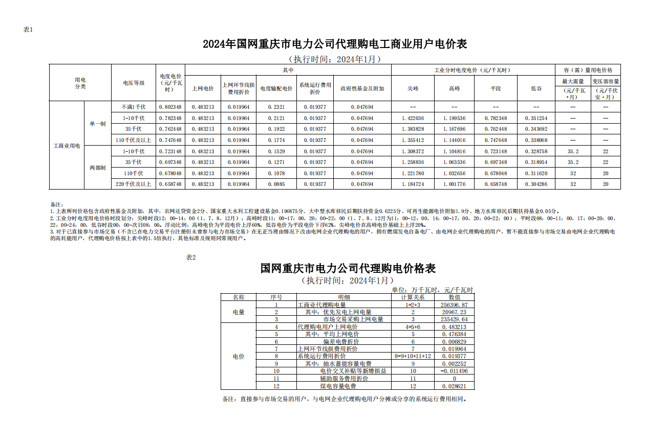 重慶市1月份代理購電工商業(yè)用戶電價表