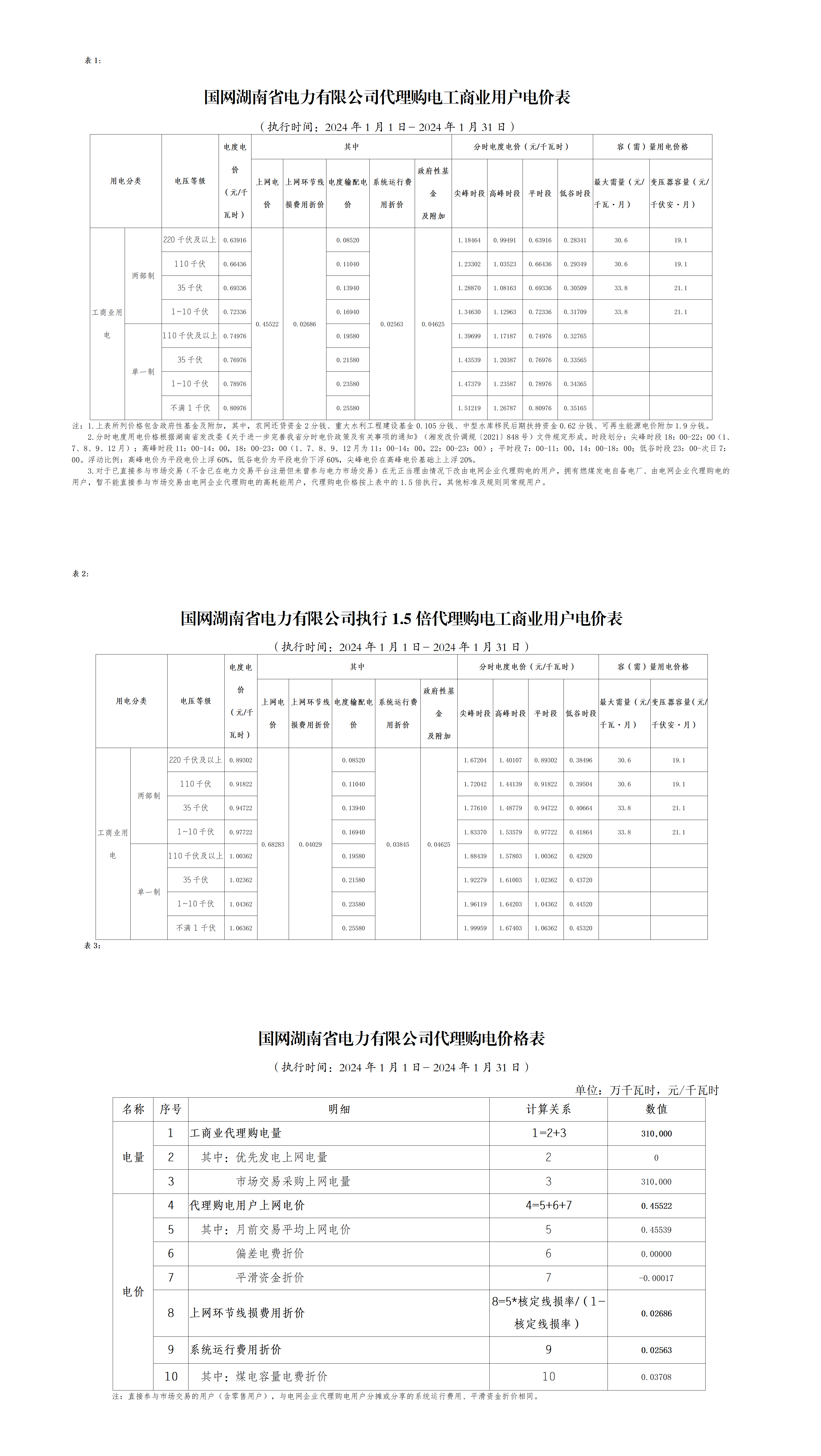 湖南省1月份代理購電工商業(yè)用戶電價表