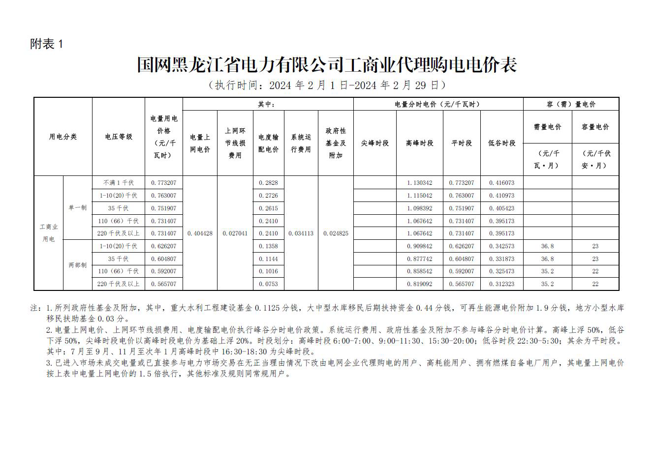 黑龍江省2月份代理購電工商業(yè)用戶電價表