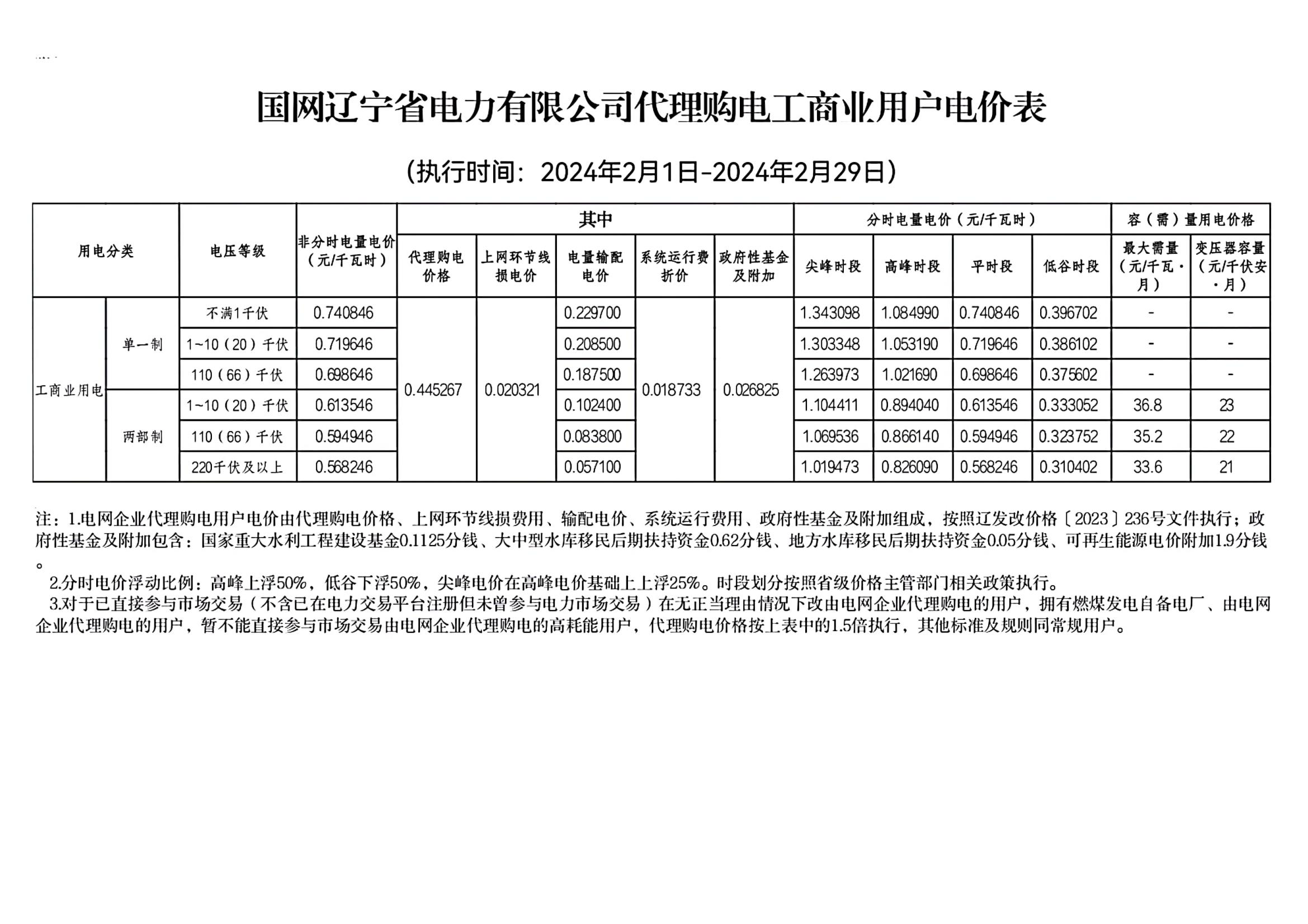 遼寧省2月份代理購電工商業(yè)用戶電價表