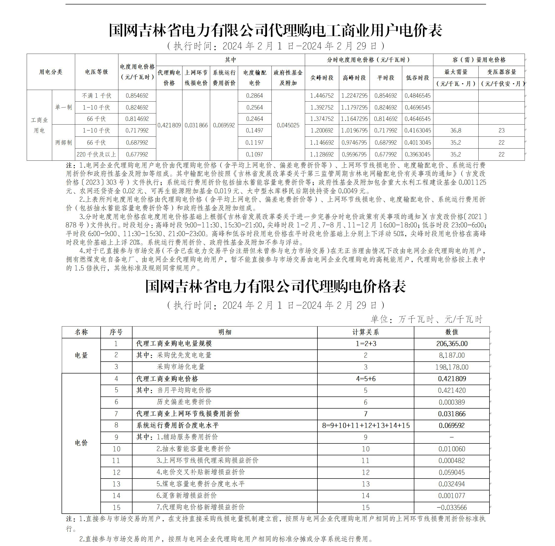 吉林省2月份代理購電工商業(yè)用戶電價表