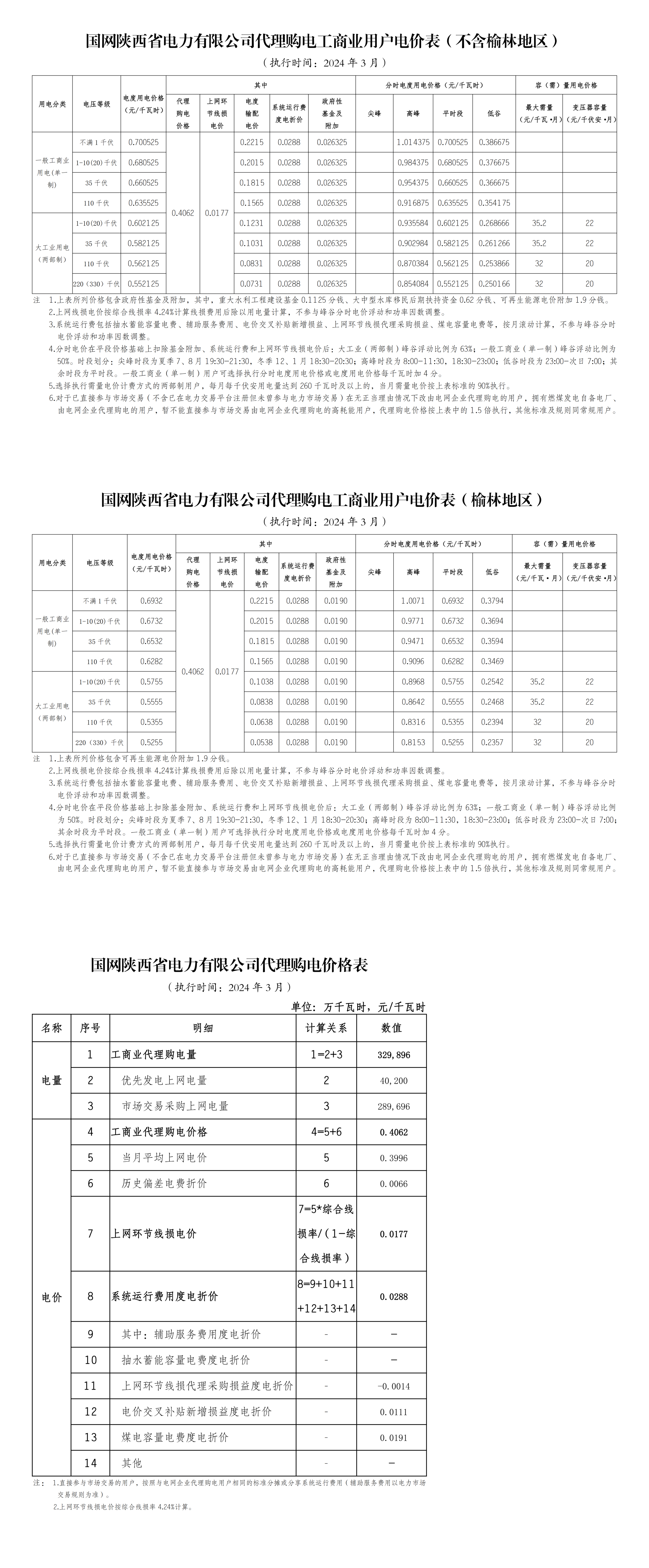 陜西省3月份代理購(gòu)電工商業(yè)用戶電價(jià)表